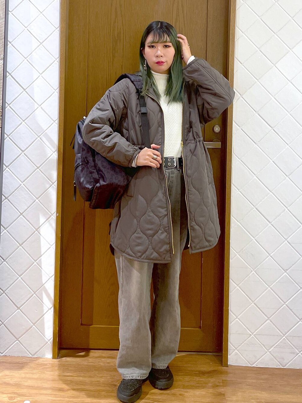 megu46mi(GLOBAL WORK わさだタウン)のその他アウター「ウツクシルエットライトウォームキルトコート/115513」を使ったコーディネート