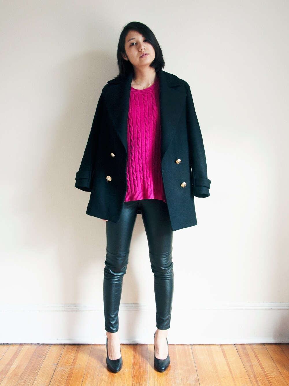 leatherette ほぼブラックでも、レザーパンツのように、素材がまちまちだと何だかまとまって見える不思議。 でも折角街はクリスマス気分なので、ピンクを着てみました。 セーターは古着に限る。安いし丈夫だし :-) セーター:古着 レザーパンツ:H&M コート:ZARA パンプス:Banana Republic ♬ The XX - Angels