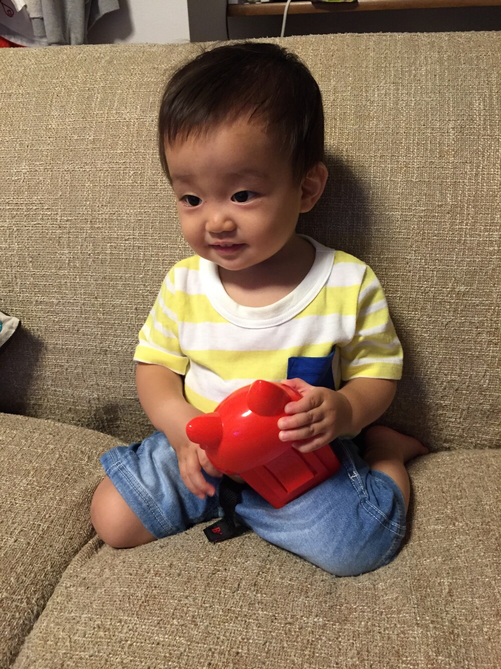 妖怪ウォッチのポテトケースに夢中! この、ポテトケース首のところ外したら生首みたいになるねんけどね…(笑) 黄色のボーダーが眩しい! ポケットがワンポイントでかわいいわ!
