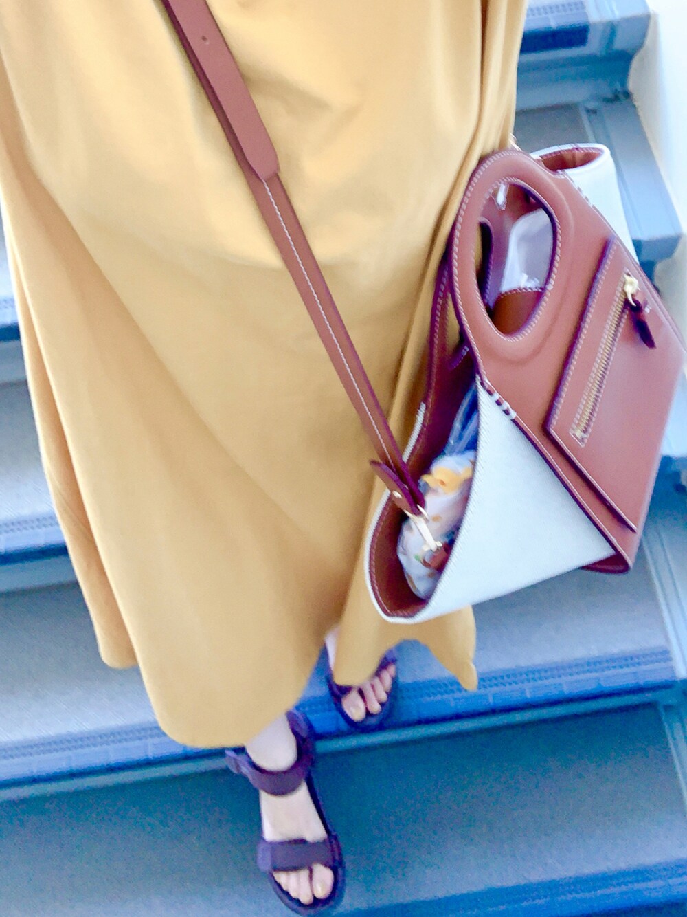 ブラウンレザーにステッチのデザイン、 バッグがお気に入りです😆🤎 ネイルもイエロー👊🏻🍋