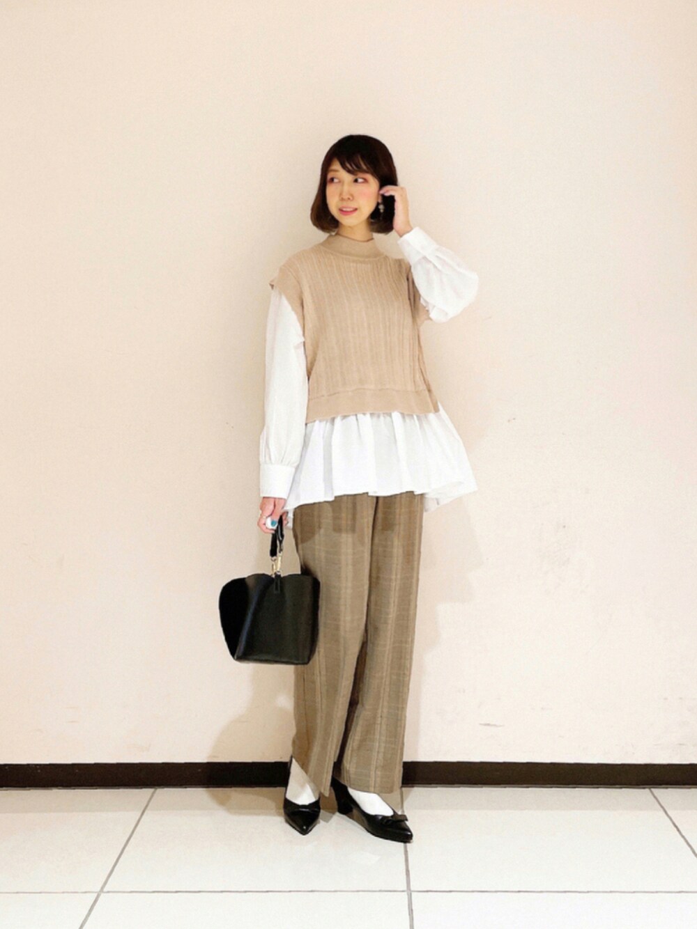 megのニット/セーター「ランダムリブシャツドッキングニット」を使ったコーディネート