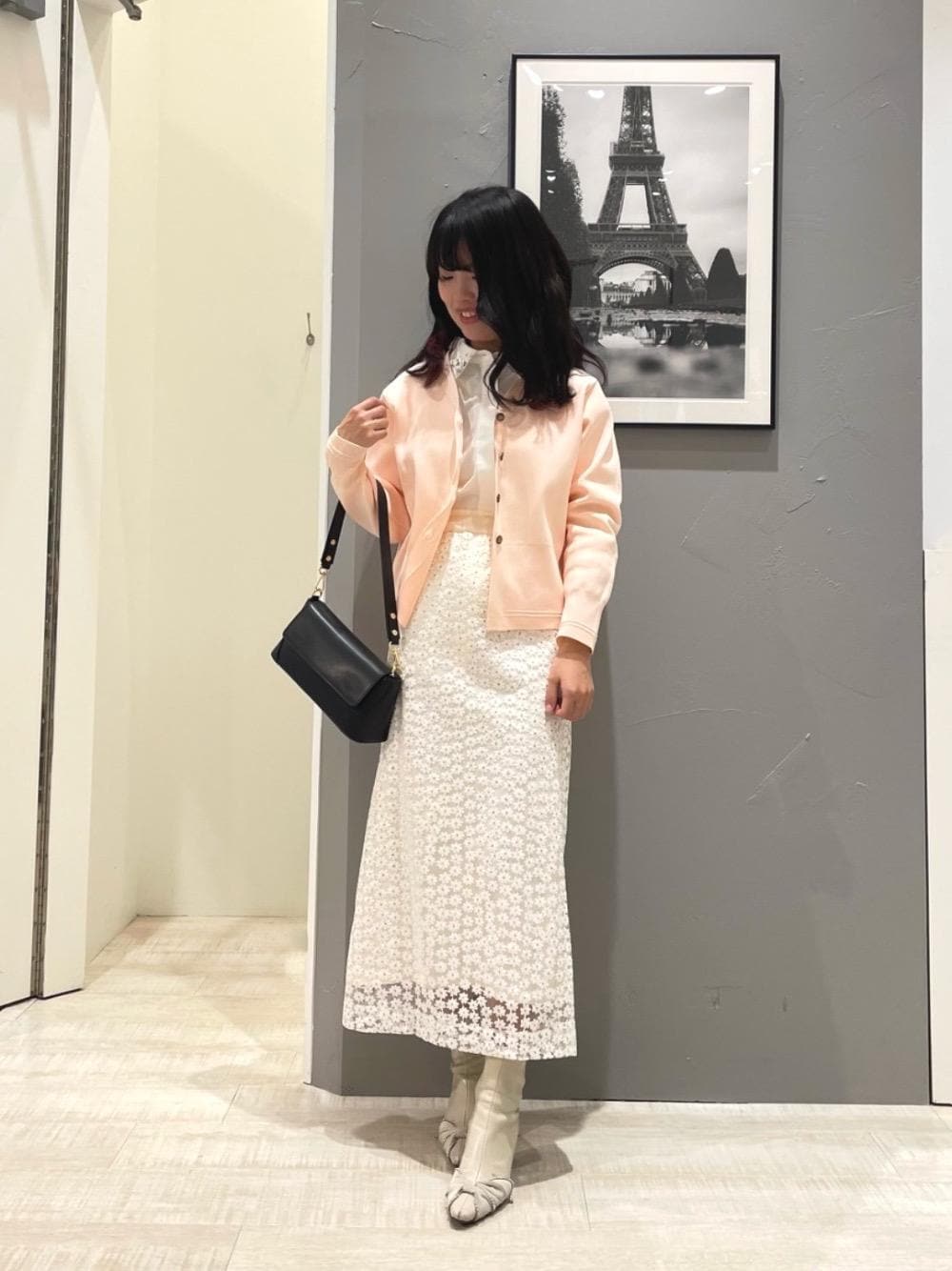 20代/160cm/骨格ウェーブ /普段サイズ36〜38/着用サイズ38 【スムースニットVネックカーディガン】 サイズ感:腰骨が隠れるくらいの長さで程よくゆとりあり 素材感:もちもちした手触りで伸縮性あり 着用感:フェミニンにもカジュアルにも◎ 【ビジューカラーシャツ】 サイズ感:程よくゆとりあり 素材感:パリッとしたハリのあるシワになりにくい素材 着用感:襟元のビジューが華やかで目を惹くデザイン◎ 【フラワー刺繍レーススカート】 サイズ感:ウエストゴムでストレスフリーに履ける 素材感:薄手でハリのあるレース素材 着用感:Iラインですっきりしたシルエット