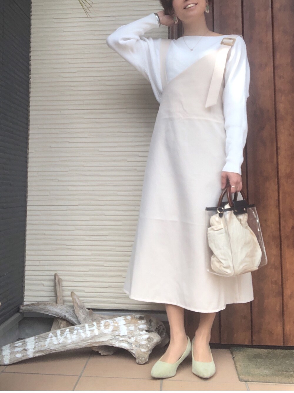ワントーンコーデに足元はピスタチオグリーンのパンプスで春コーデ💕💕 気づいたら全身しまむらだった日🙈 ←よくあるある🤣 ワンショルのワンピしまむらで見つけて一目惚れ❣️
