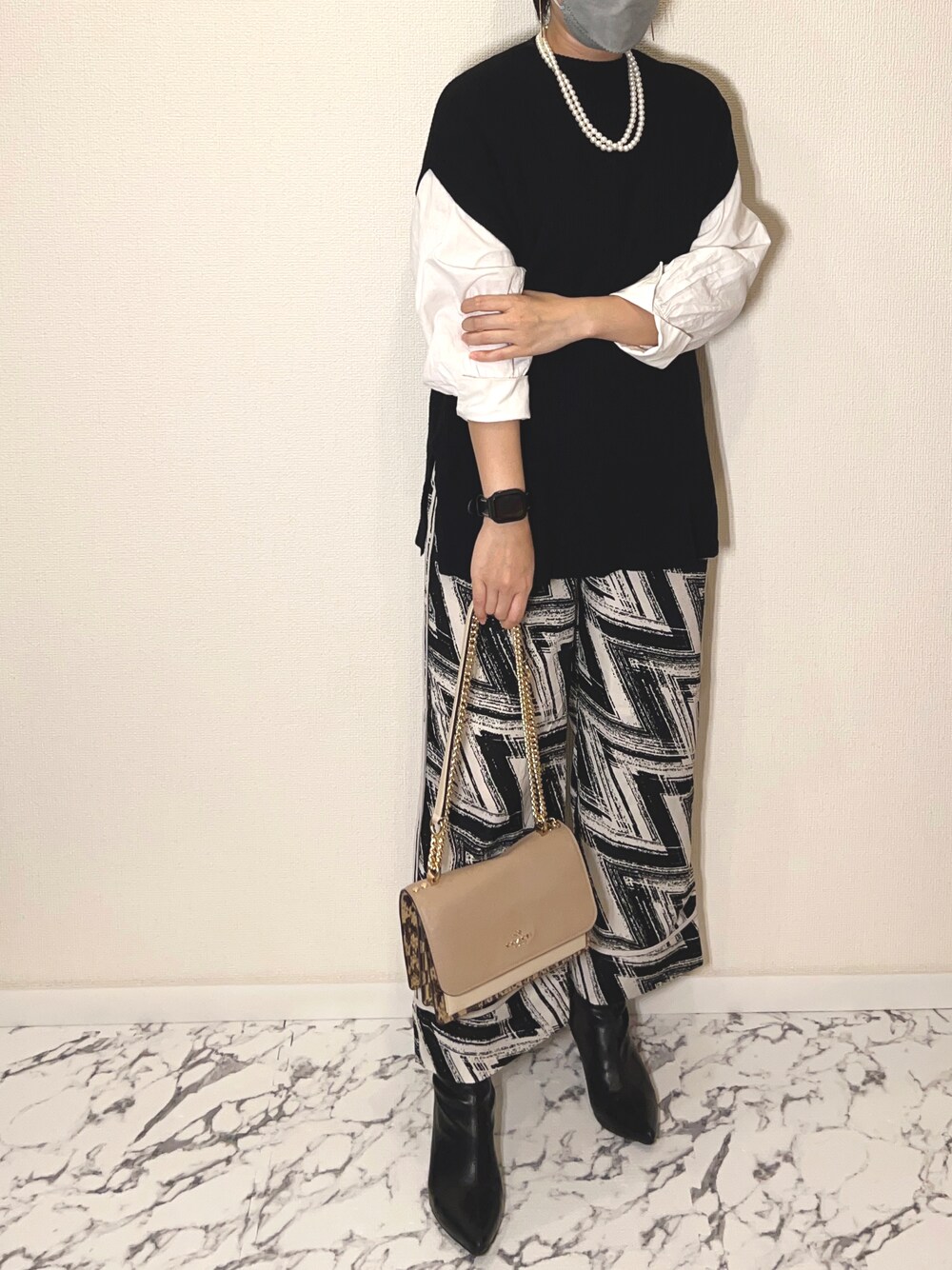 本日は柄のボトムスをアクセントにシャツコーデ! パールのネックレスを合わせると高見えになります。☺️