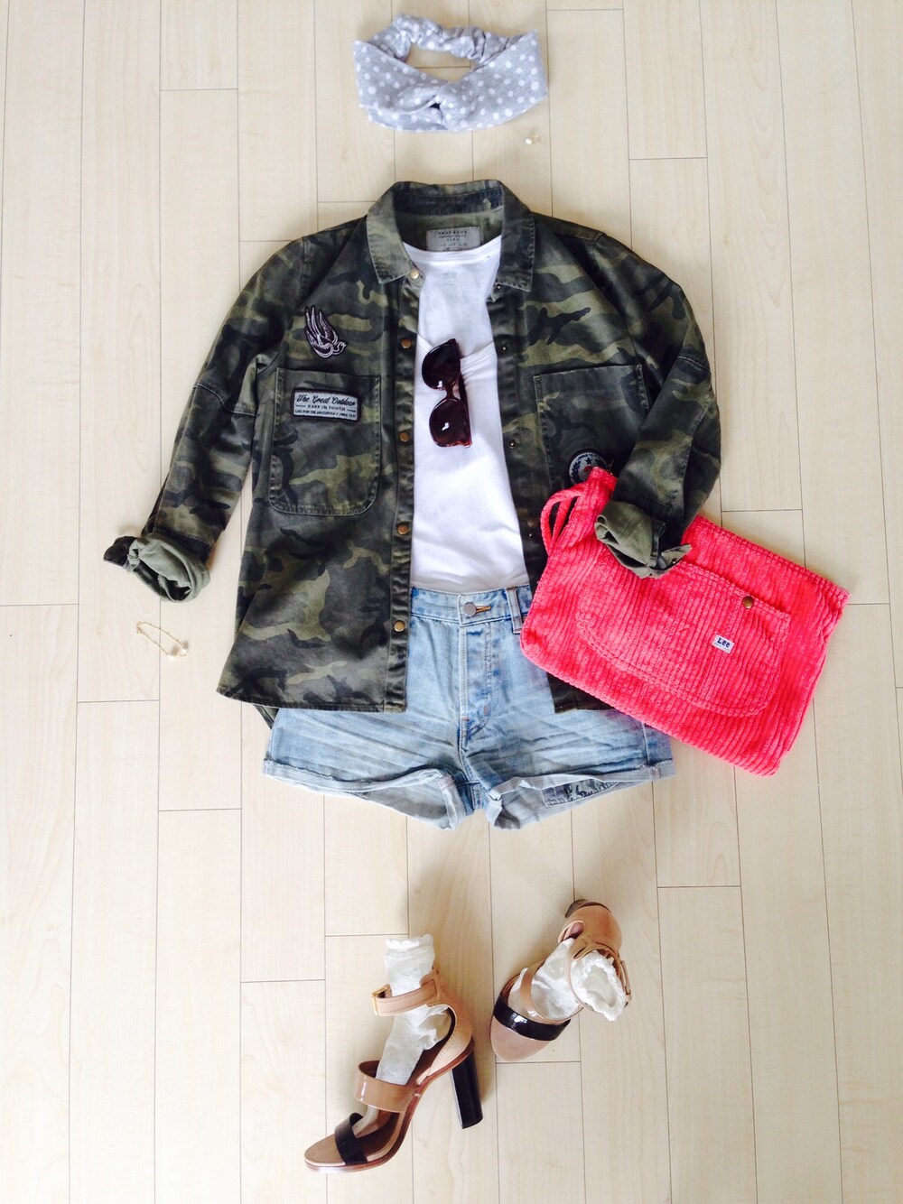 カジュアルなカモフラ柄シャツ×デニムショーパンには、可愛い小物合わせます♥︎ 手作りしたヘアバンドと、パールのイヤーカフとブレスレット、ピンクのクラッチに、久しぶりのヒール☺︎ ただ、ショートパンツがきつくなってる… カットソー/UNIQLO シャツ/zara デニムショートパンツ/昔すぎて忘れました 靴/GRACECONTINENTAL バッグ/lee イヤーカフ/Me+Her Me+Herという名前で、アクセサリー作ってますー☻ minne/http://minne.com/meher instagramID/meher002