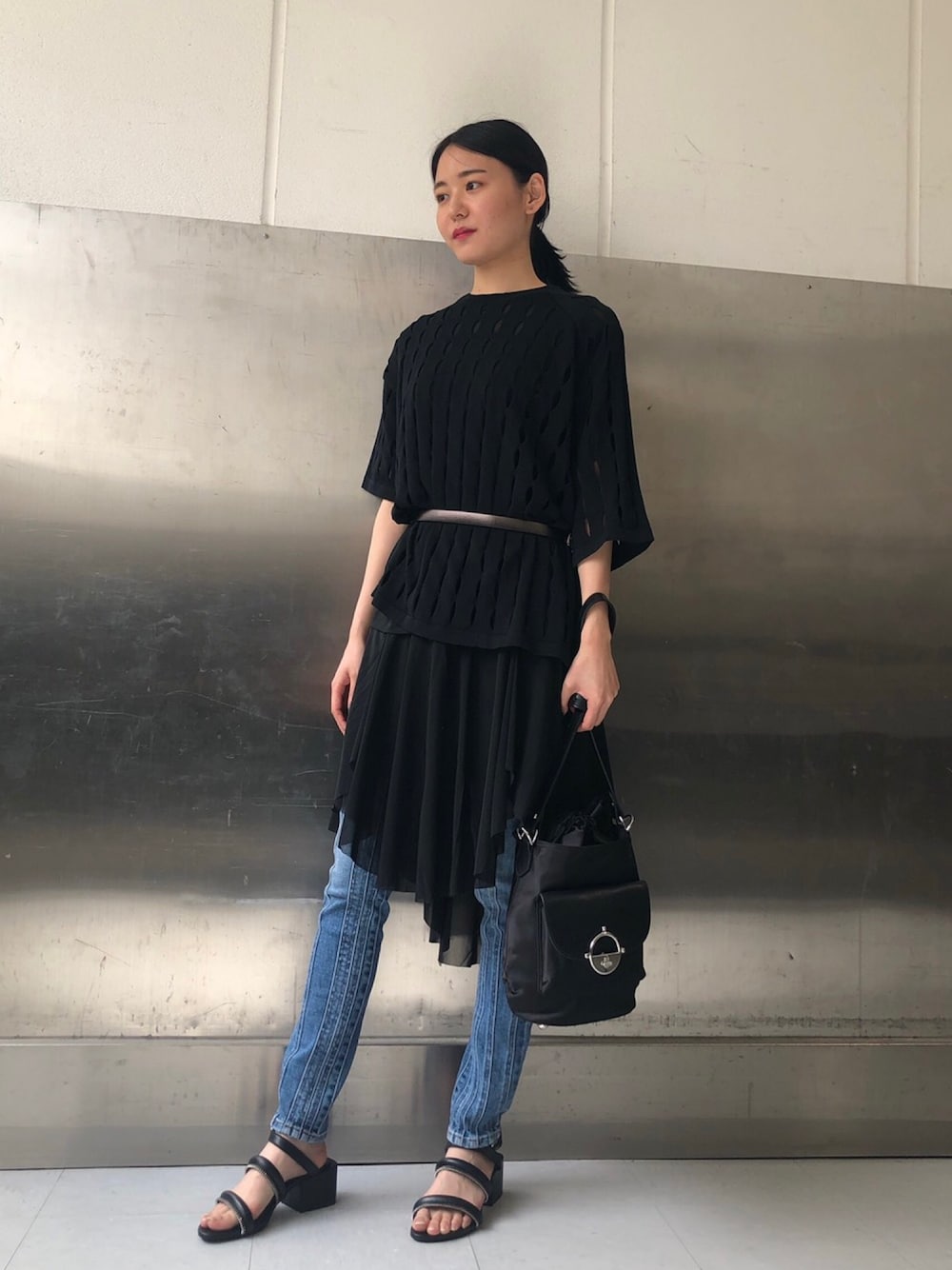 Meiのニット/セーター「レディース ニット シースルー 半袖 アシンメトリー」を使ったコーディネート