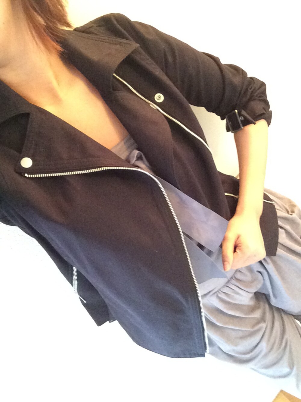 ブラック系のライダースジャケットを着用したレディースの春コーディネートの1枚目の写真