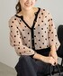 ・シアー感のあるドットプリントの布帛生地に、ニットのリブの付属を付けた、ブラウスライクなカーディガン ・軽い着心地と、柔らかい肌触りが特徴 ・前を開けて軽く羽織っても、釦を留めてブラウス感覚で着ても◎ ・ワンピースやオールインワンなどに羽織るのもおすすめ ・カジュアルにもエレガントにも着こなせる便利な1枚