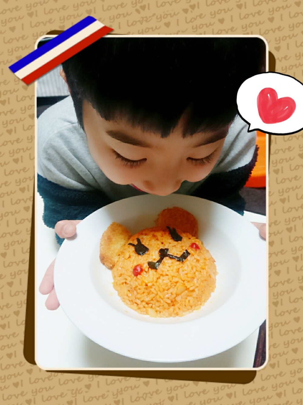 こやぎさん🐐こーで いつかのこやぎさん🐐👦💕 こやぎさん🐐の注文する オムライスはたまごなしw (ケチャップライス🍚💦) 動物の顔で注文されるので😱 お耳はコロッケのくまさんです🐻♥️