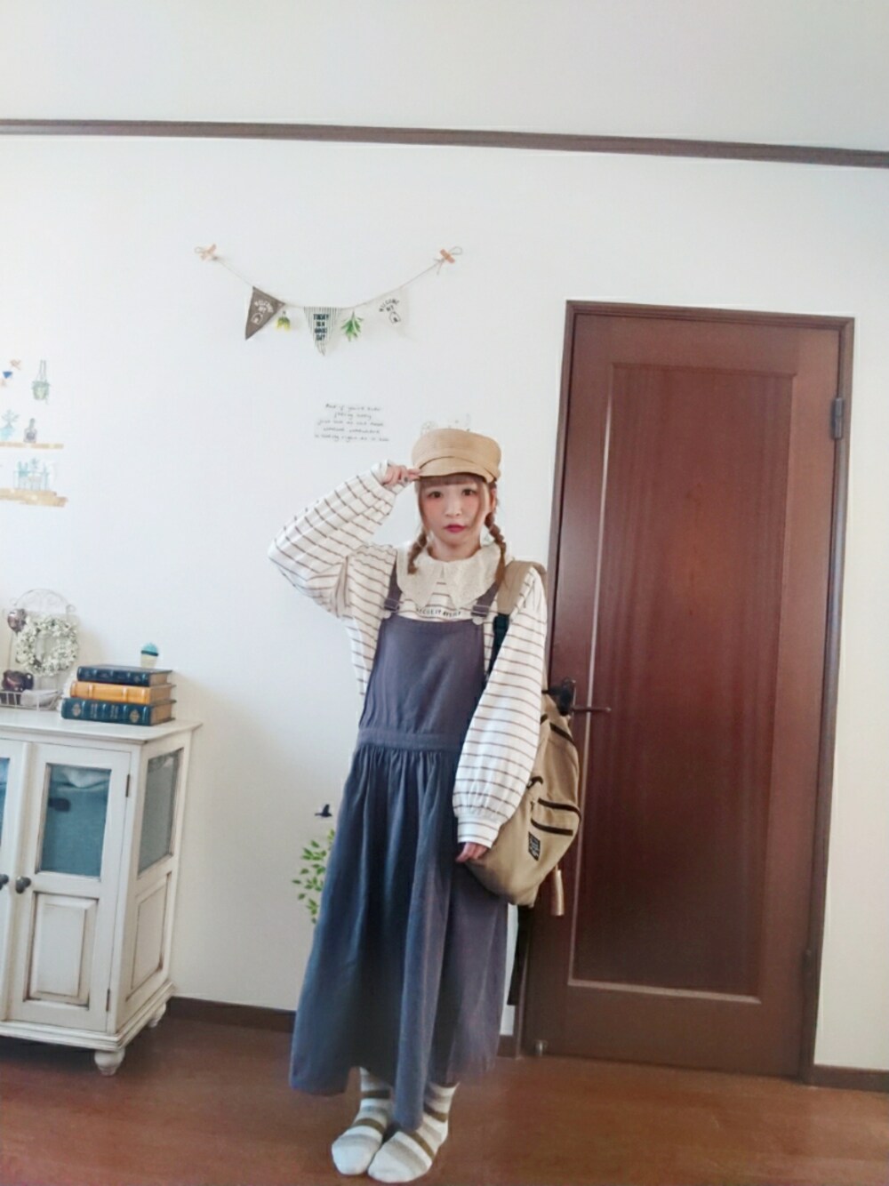 おーやぎ🐐こーで いいね*ふぉろー*お気に入り とっても嬉しいです(*´艸`)🌼 トップスも靴下もボーダー🙈w こやぎさん🐐の帰りが早い日なので 動きやすいジャンスカこーで😆♥️