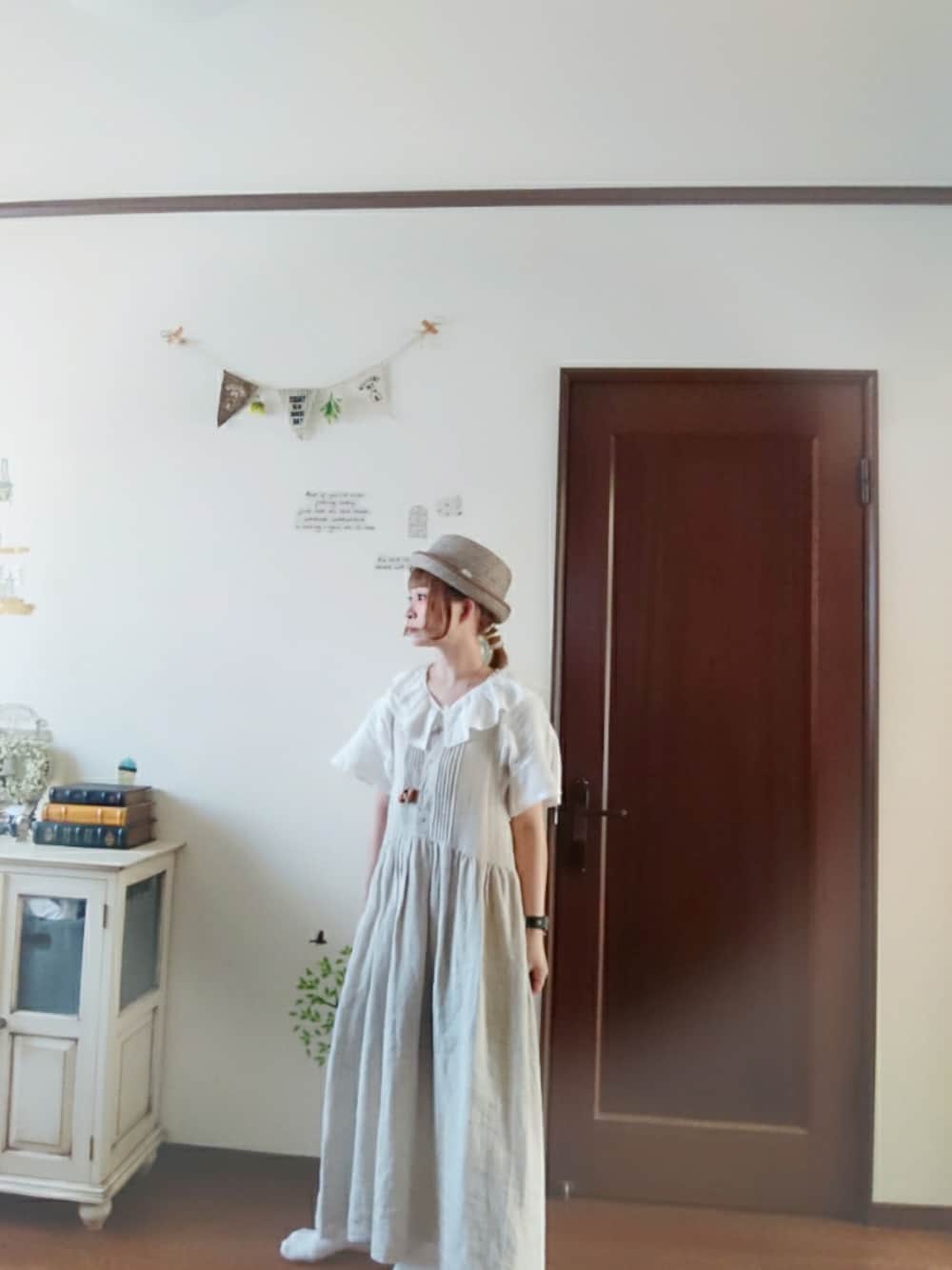mek0のワンピース「リネン前後着エプロンワンピース」を使ったコーディネート