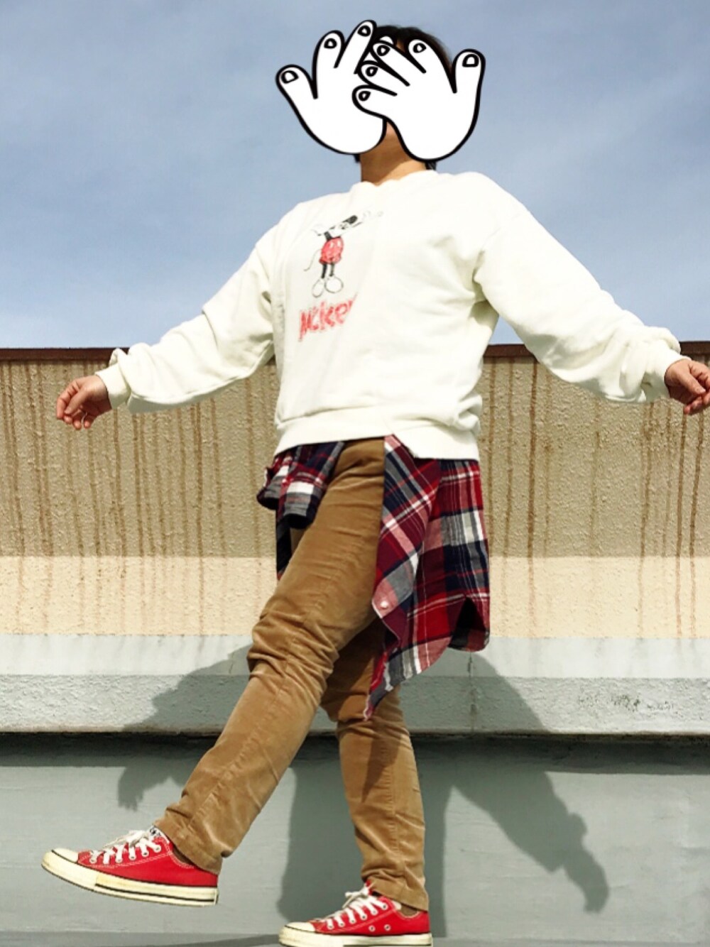 GLOBALWORKのディズニーコラボ、一目惚れで購入😊プリントがレトロな感じで好きです 朝は寒かったけど、だんだんあったかくなってきたのでシャツは脱いで腰に巻いちゃいました 屋上も風がなくてポカポカ🌤