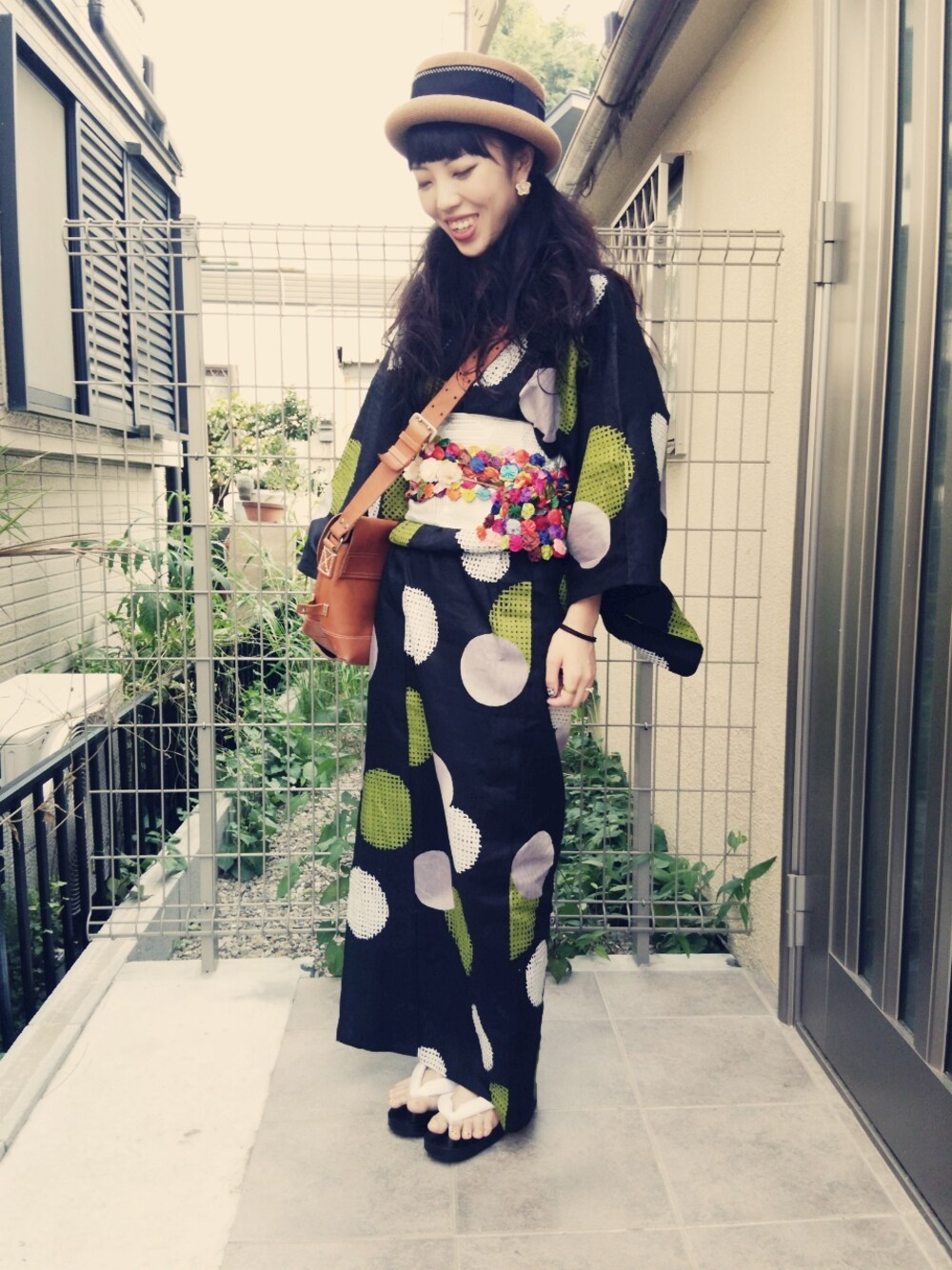 y2の浴衣「ホンコマダムさんの ドット浴衣」を使ったコーディネート