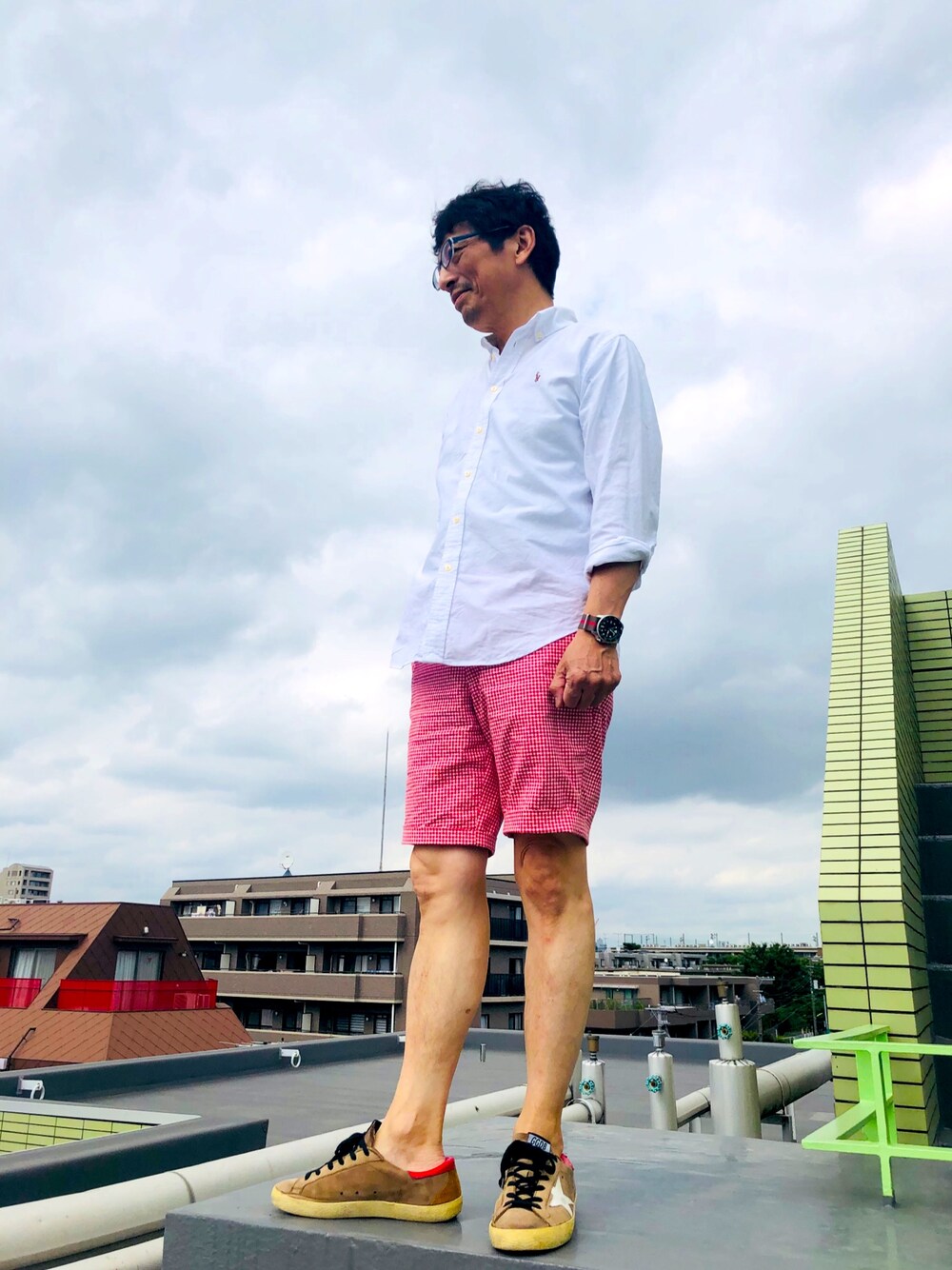 梅雨の、晴れ間というか曇り間(笑)で、ようやく外で撮れました。早くからっと晴れた夏空が見たいですねー! ラルフローレンのシャツは、私の場合メンズサイズだとタックアウトするには長すぎるので、ボーイズの16を愛用しております(笑)。本当は16〜18がいいんだけど、ちょっとだけ長いんですよね。難しい。 腕時計のNatoタイプベルトのキャメル×赤とゴールデングーススニーカーのキャメル×赤を合わせたてみたつもり。しょうもないこだわりです(笑)