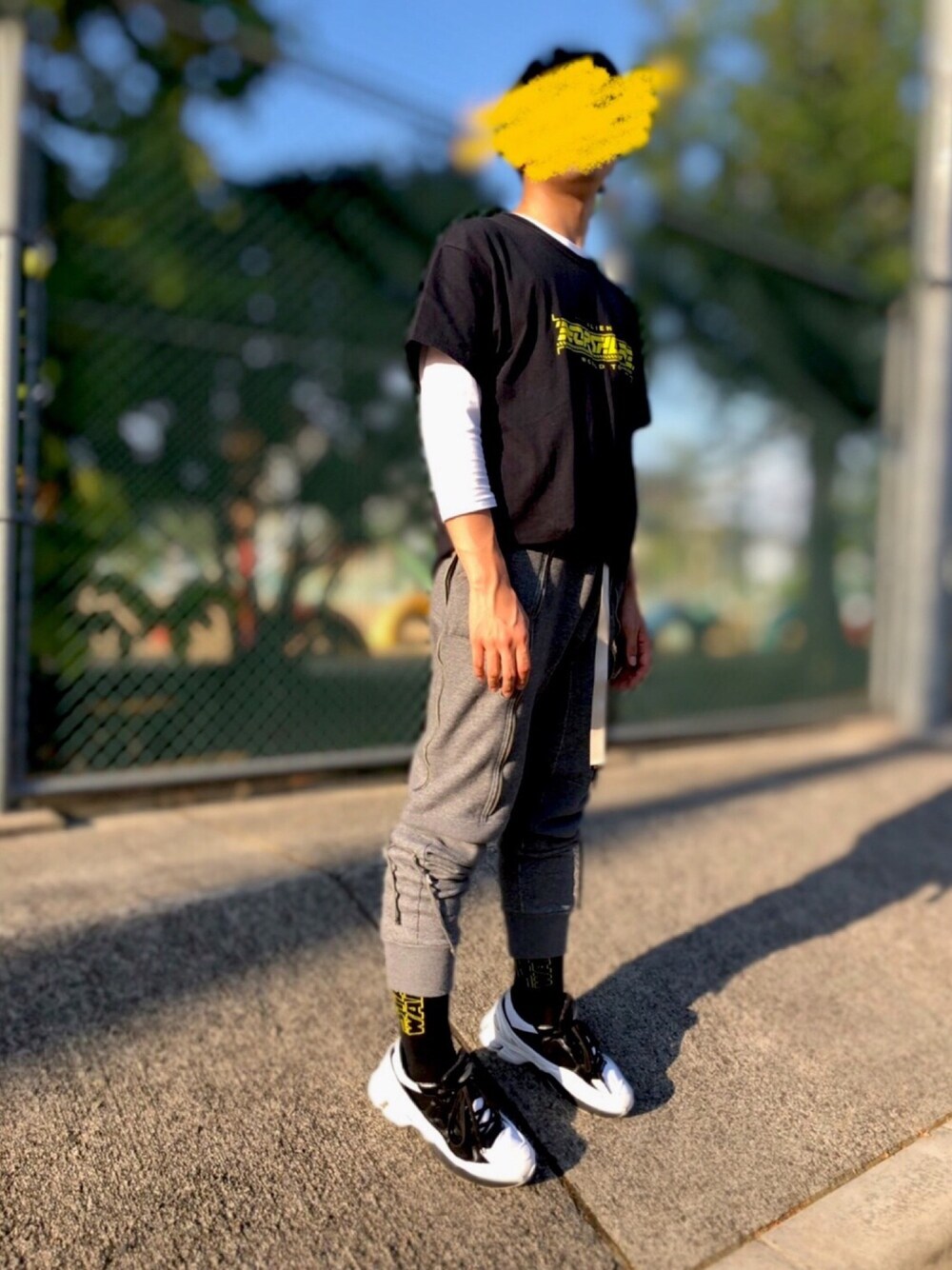 こんばんは! モノトーン+黄色差し色ストリートです。 黒ベース黄色字のTシャツに、七分袖の白インナーをあわせ、 ボトムスはUNDERCOVERの癖強スウェットパンツを履き、スニーカーやH&Mのソックスを合わせました。 自分の中ではかなり攻めたコーデです。 いいなと思ったらポチッとお願いします~ また投稿します!