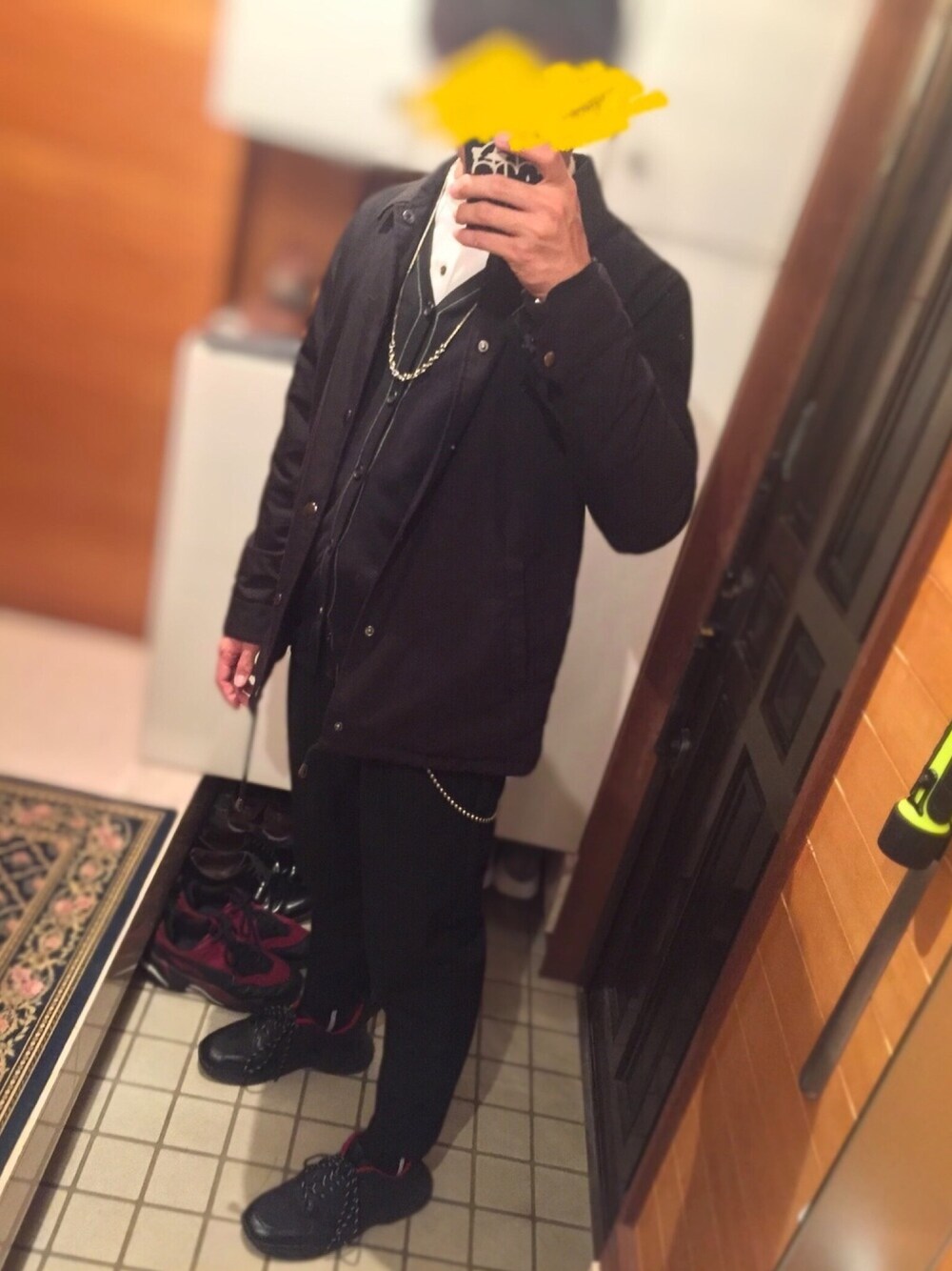 こんばんは、今回はキレイめストリートです。 黒のコーチジャケットの下に、最近お気に入りのSOPHNET.のカーディガンを合わせ、その下に白スタンドカラーシャツを入れて、スタイリッシュにしました。 そこに黒スラックスとウォレットチェーン、足元はGUのダッドスニーカーです。 最後に、足元にCHICKSTOCKSのストライプソックスを入れ、黒だらけの中に白でアクセントをつけました。 最後まで見てくださりありがとうございます。また投稿します!