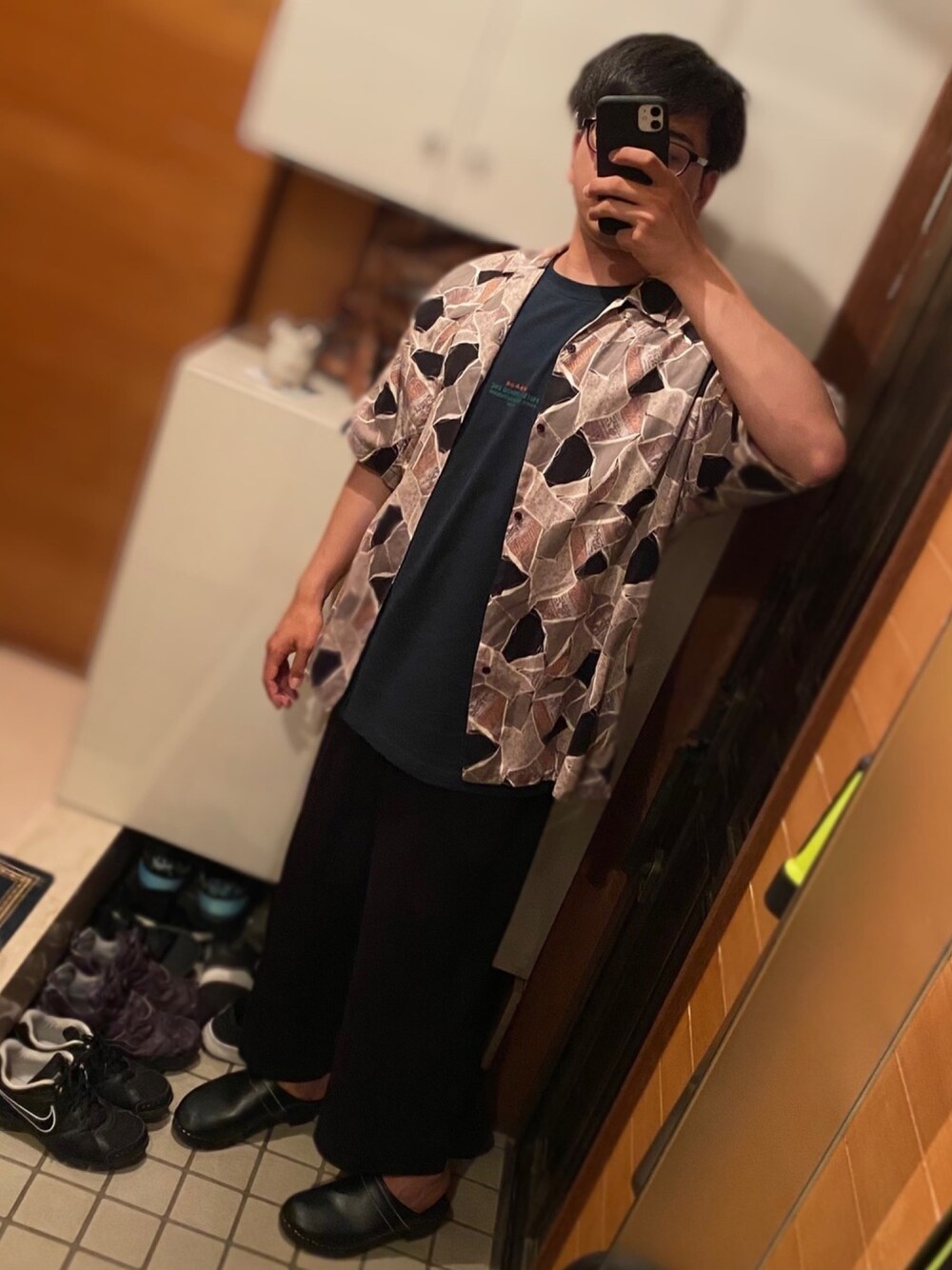 おはようございます。 今日は古着のアロハシャツを使ったゆるコーデです。 TOWNCRAFTのアロハシャツは、2年前ぐらいに沖縄の古着屋で買ったやつです。 こういう柄でも一応アロハシャツの一種らしいです。 50年代のものらしいですが、全然廃れてません! その中に、たまたま暇つぶしに行ったRAGEBLUEで見つけたTシャツを合わせました。 架空の企業ロゴをプリントしたやつらしく、控えめな前面プリントに対し、背中全面に施されたプリントがインパクトあります。 下はKNOTTのサルエルパンツを中古で見つけたので買いました。 シャカシャカ系素材でサイズ感もゆるく、履きやすいです。 足元はサンダルですが、少し高級感出るようにレザーサンダルにしました! 最後まで見て下さりありがとうございます、また投稿します!