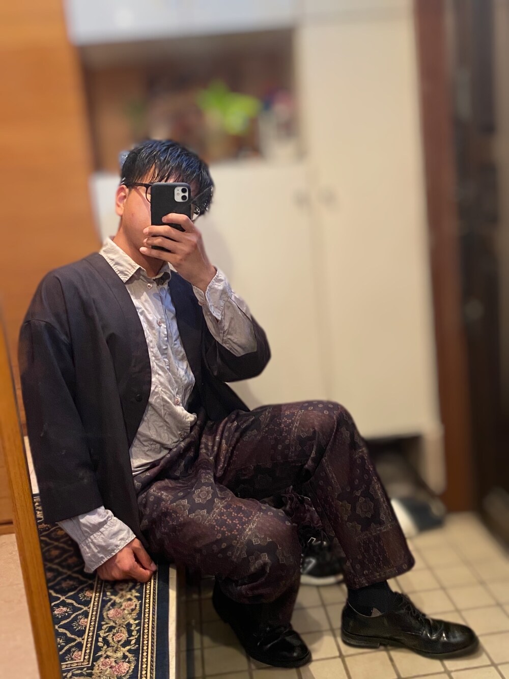おはようございます。 今日は柄にハマって購入したパンツを使ったコーデです。 ダマスク柄という独特な柄をしたパンツはRAGEBLUEで購入しました。 柄パンツの中でも、色味が落ち着いてて使いやすいと思います。 上品目なカジュアルとかモード寄りのファッションで使えそうです。 上のシャツは古着屋で購入しました。 画像だと分かりにくいですが、前身頃に切りっぱなしの加工がされてあり、シンプルな細身シルエットながら存在感があります。 グレーのシャツだけだと少し上半身が抜けて見えるので、自分らしく黒のライトアウターを加えました。 最後まで見て下さりありがとうございました、また投稿します!