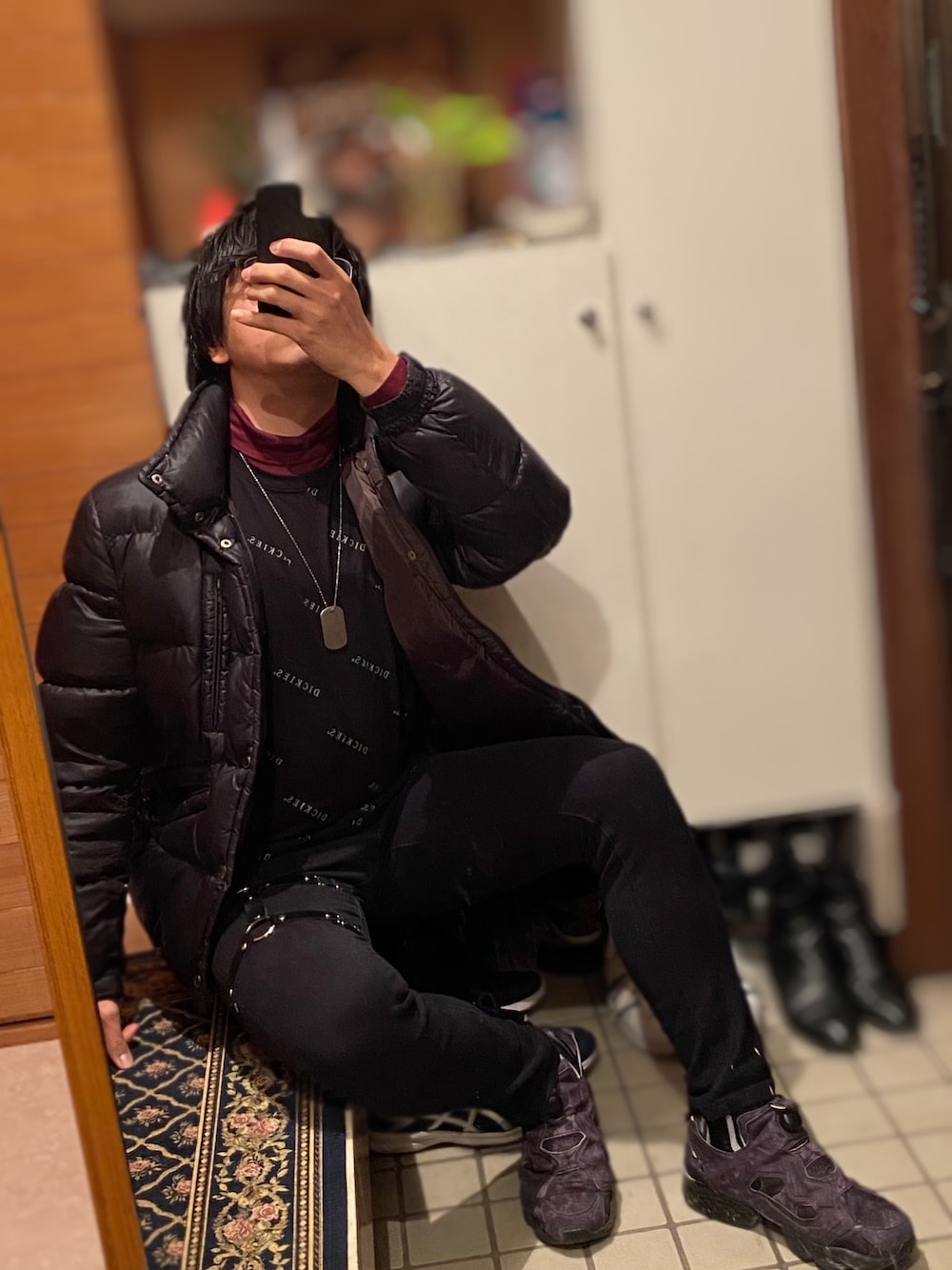 おはようございます。 今日はシンプルなコーデです。 ダウンの下に、自分としては珍しい組み合わせをしました。 ワイン色のタートルネックの上に、DickiesのモノグラムTシャツを合わせました。 これはドンキでたまたま見つけ、購入しました。笑 ドンキの割に珍しいもの置いてるな、と思って買いました笑 あとはネックレスやレッグハーネスをアクセントで加え、足元にはラインソックスとVETEMENTSReebokコラボのポンプを合わせました! 最後まで見てくださりありがとうございます、また投稿します!