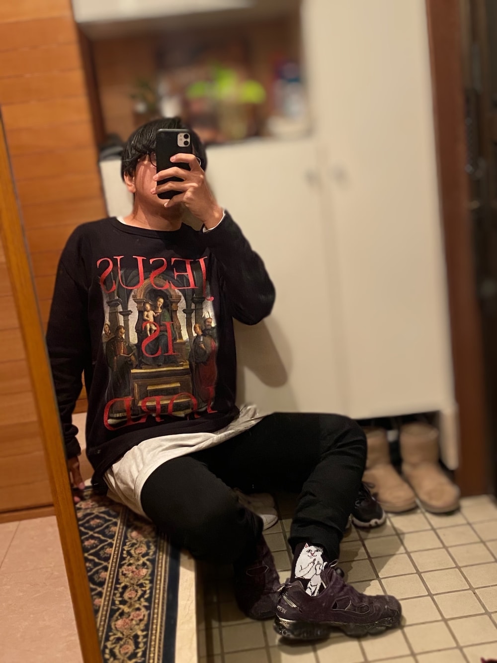 あけましておめでとうございます! 今年もよければ見ていってください! 新年最初は気に入ったこのTシャツを使ったコーデです。 本来はこれにダウンを着ていたのですがあまり相性が良くなさそうだったので脱いで撮影しました。笑 中世の絵に遊び心の効いたフレーズを入れ、ロック、パンクなテイストとなっています。 また、普通のTシャツと違い独特な生地感をしています。 薄くもなく、かと言って厚くもない、ざっくりとした縫いで独特です。 その下にはダメージ感のあるNILOSのロングカットソーを合わせ、レイヤードを楽しみました。 立ち絵も載せてるので、気になる方はぜひ! あとは個人的な定番アイテム2つと、足元に挑発した猫ちゃんを忍ばせました。 最後まで見て下さりありがとうございました、また投稿します!