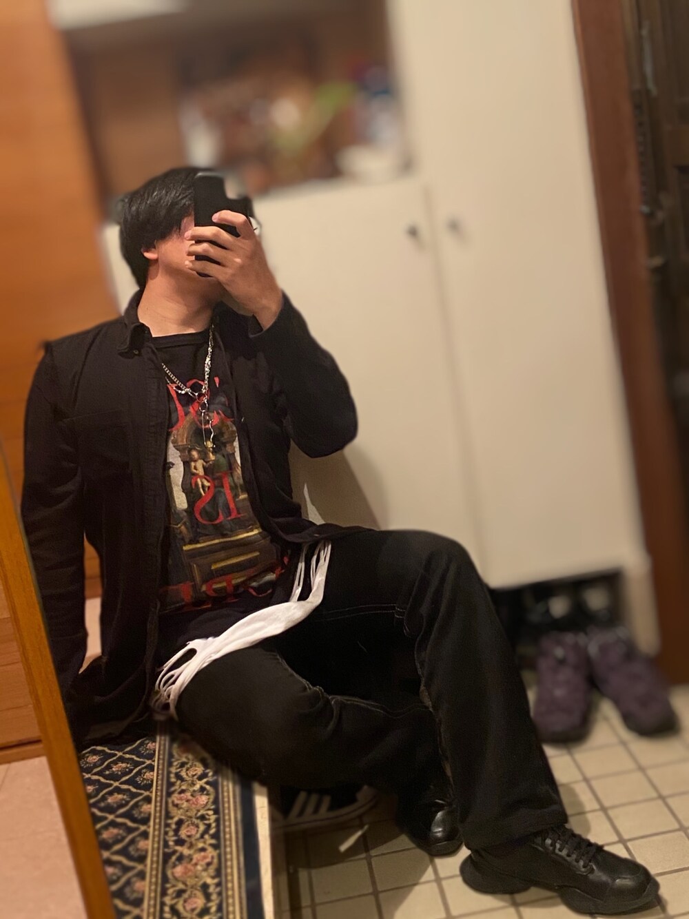 おはようございます。 今日はパンク寄りなストリートコーデです。 たまたま古着屋で見つけた、宮下さん期のNUMBER (N)INE ノースリーブロングシャツです。 やや厚手の生地なので、ベストとしても着れるのはいいかなと思いました! 切りっぱなし加工もされており、パンクっぽく見えるかと思います。 その下にはよりパンクっぽいプリントTシャツを合わせ、ダメージタンクトップでトドメです。 あっという間にゴリゴリのパンクロッカーができました。笑 下半身はそのイメージを崩さない程度に、白ステッチの入ったジーンズと、お気に入りのadidasとRick Owensコラボスニーカーを合わせました。 最後まで見てくださりありがとうございます、また投稿します!