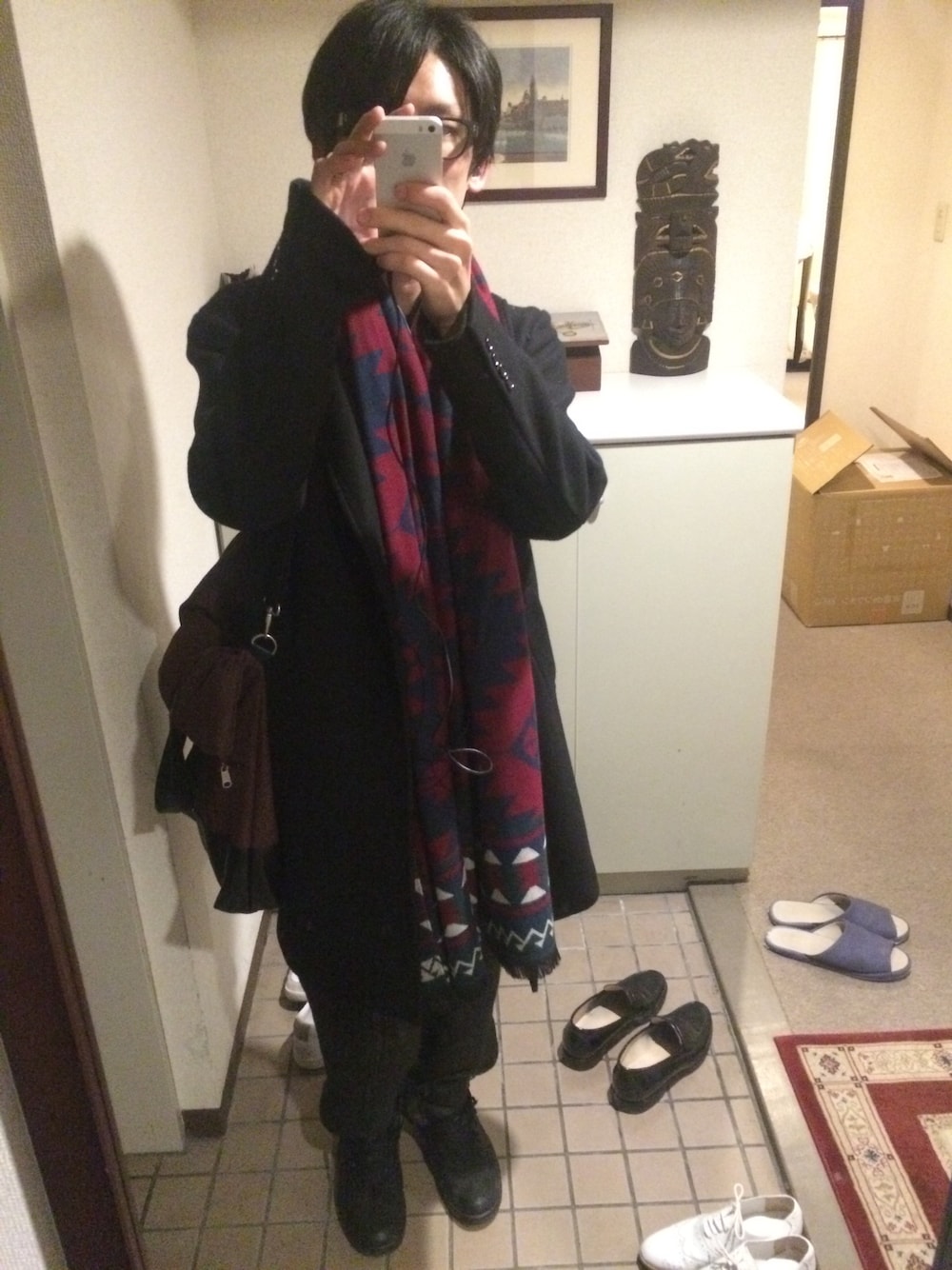 まだマフラーを下げても寒くない季節。 もうすぐ首をモフモフにしないと耐えられなくなります…。 黒のワントーンに暖かい赤を入れるのが、ベーシックだけど冬らしくて好きなスタイリング。 バギーパンツに大きめのスニーカーもいい感じ。