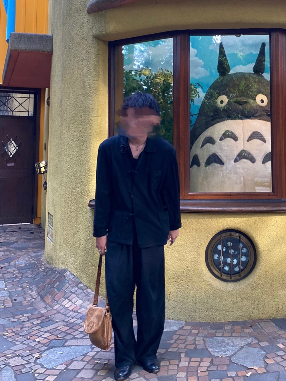 まだまだ暑いですね、、、 気持ちはもう秋気分🍂 覗き見トトロとツーショット📷 . . . Bulgarian Army garment-dyed pajamas vintage leather shoes made in Italy deerskin bag