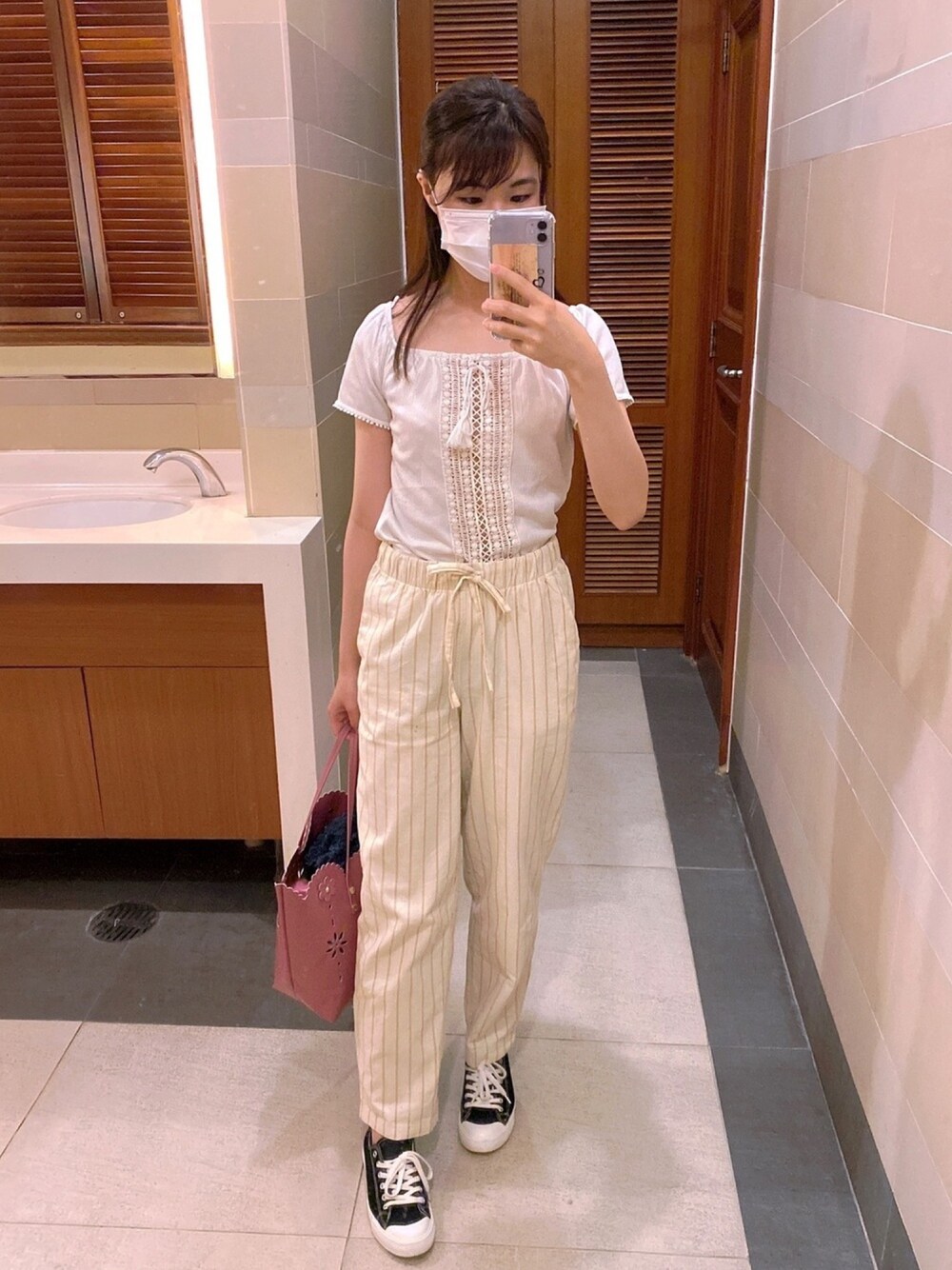 金曜日のカジュアル通勤コーデ 黄色ストライプズボンは先日ユニクロで買ったセールアイテムです