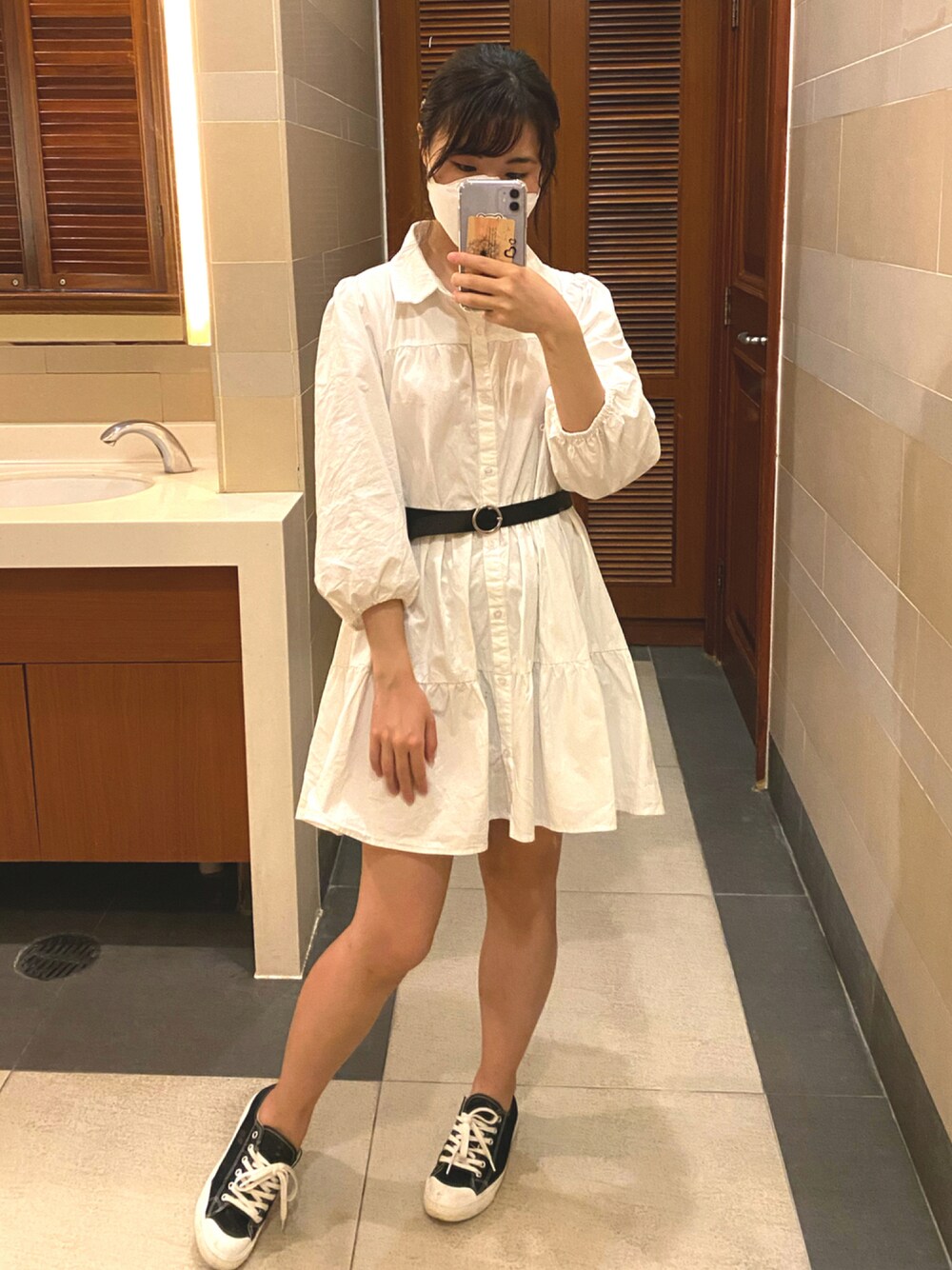 ベルトを使ったブラウスワンピース ブラウスワンピース:GRL ベルト:no brand スニーカー:無印良品