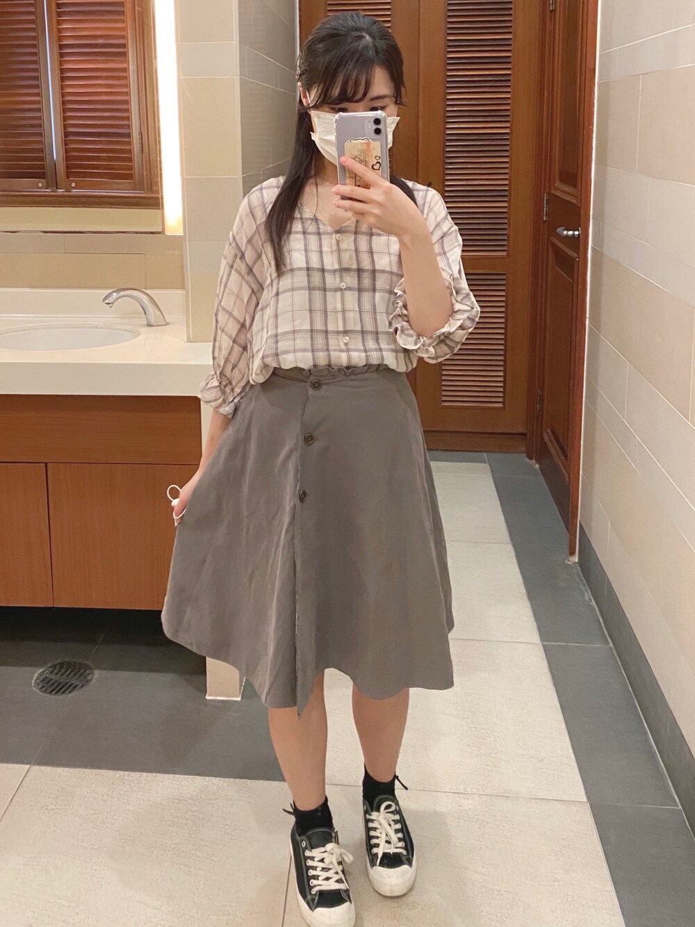 GUセールで買ったチェックブラウスを初めて着た、生地が薄くて、夏にぴったりです
