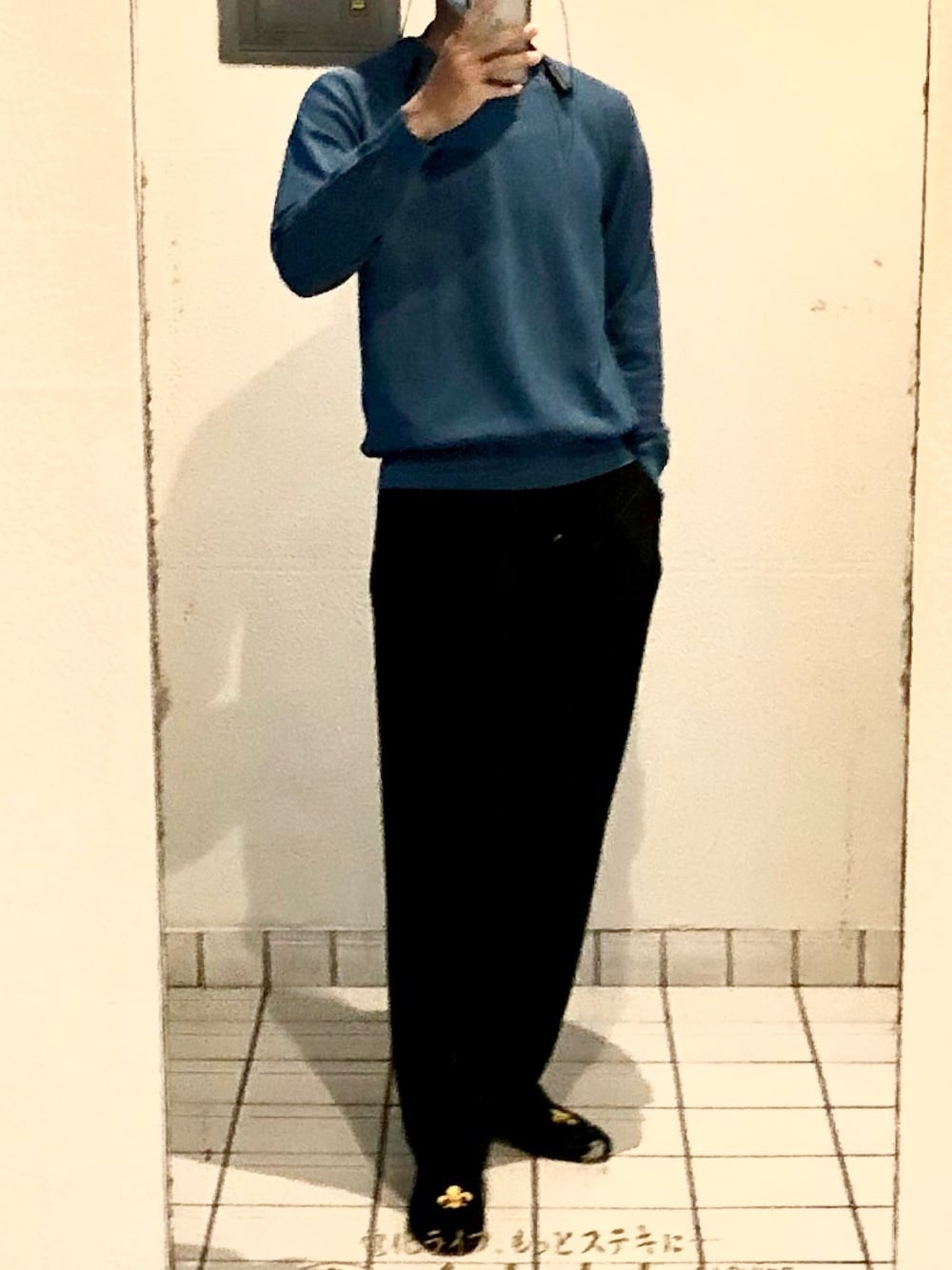 ブラックにターコイズブルーの差し色を 足元はエレガントに
