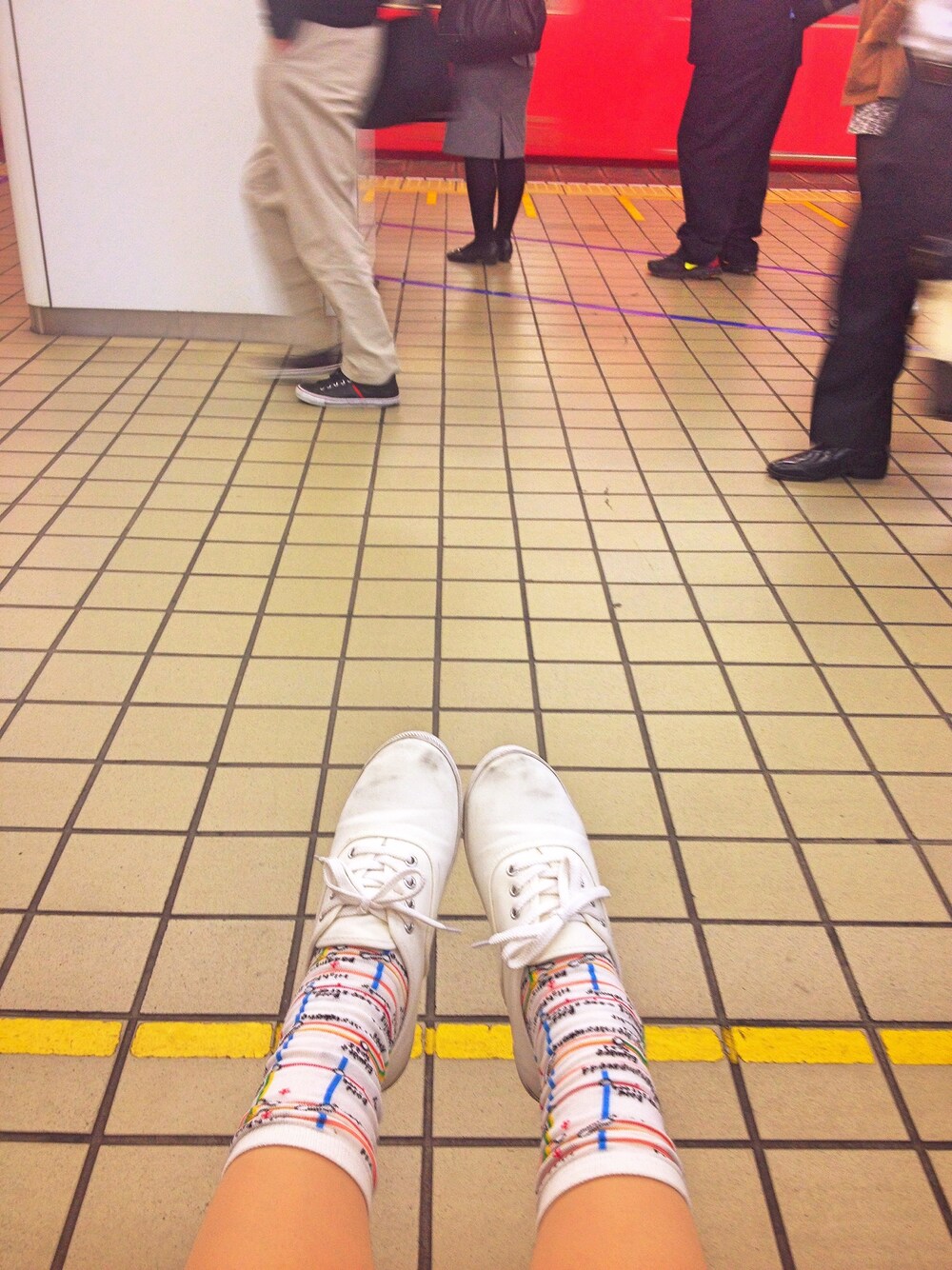 鉄道柄のスニーカーを履いて 駅のホームで、パシャリ☆彡