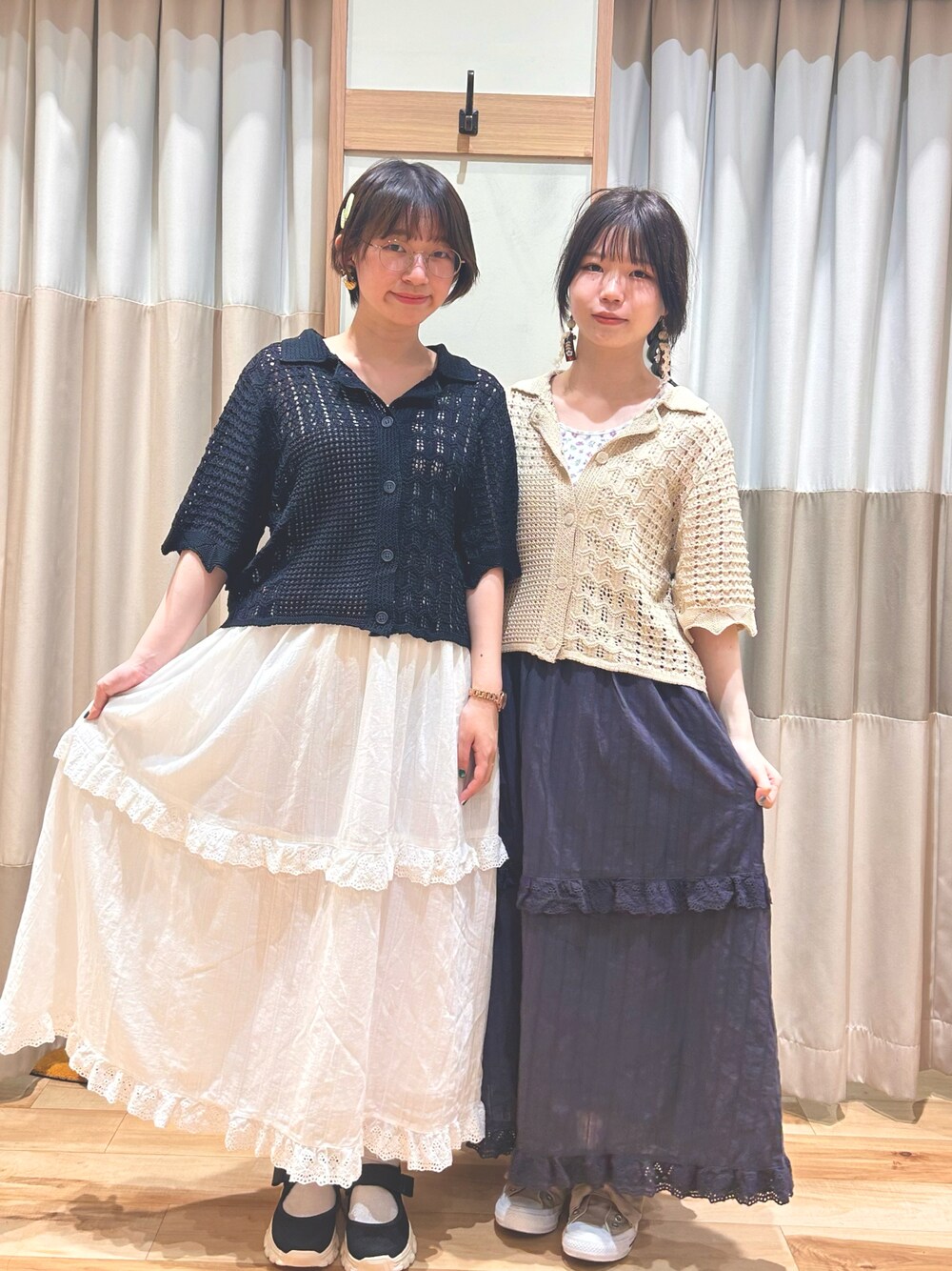 ロングスカートと透けカーディガンを使ったガーリーなコーディネートです❁ 一緒に働くスタッフ(@qo15)とリンクコーデで撮りました ·͜·