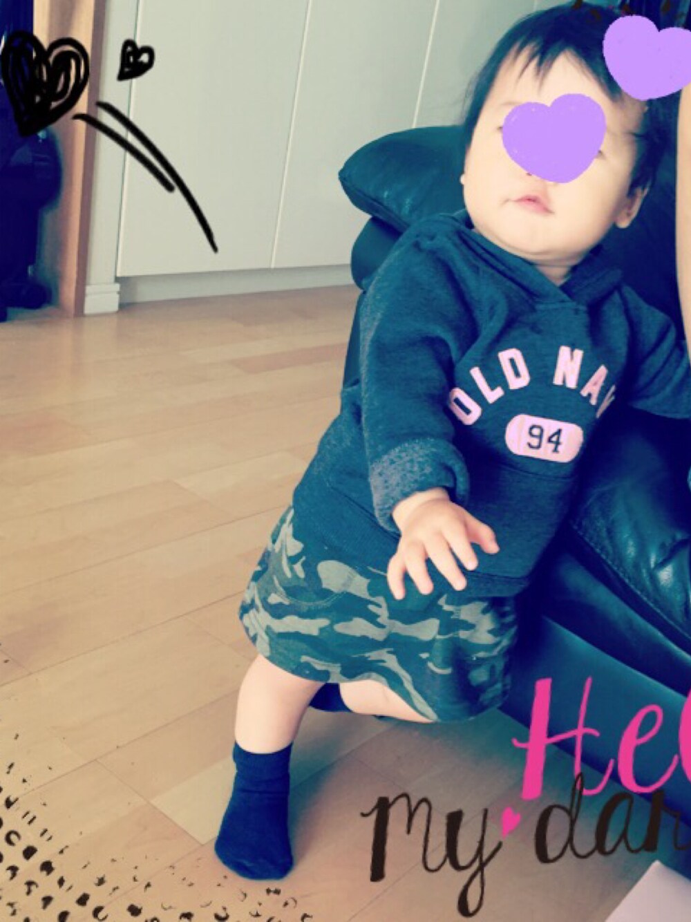 カジュアルコーデ!フリフリ系より似合うかも(*^◯^*) オールドネイビーのパーカーは半額でめちゃ安かった❤︎サイズは90ぐらい? 袖が少し大きめだけど、違和感はないかな!
