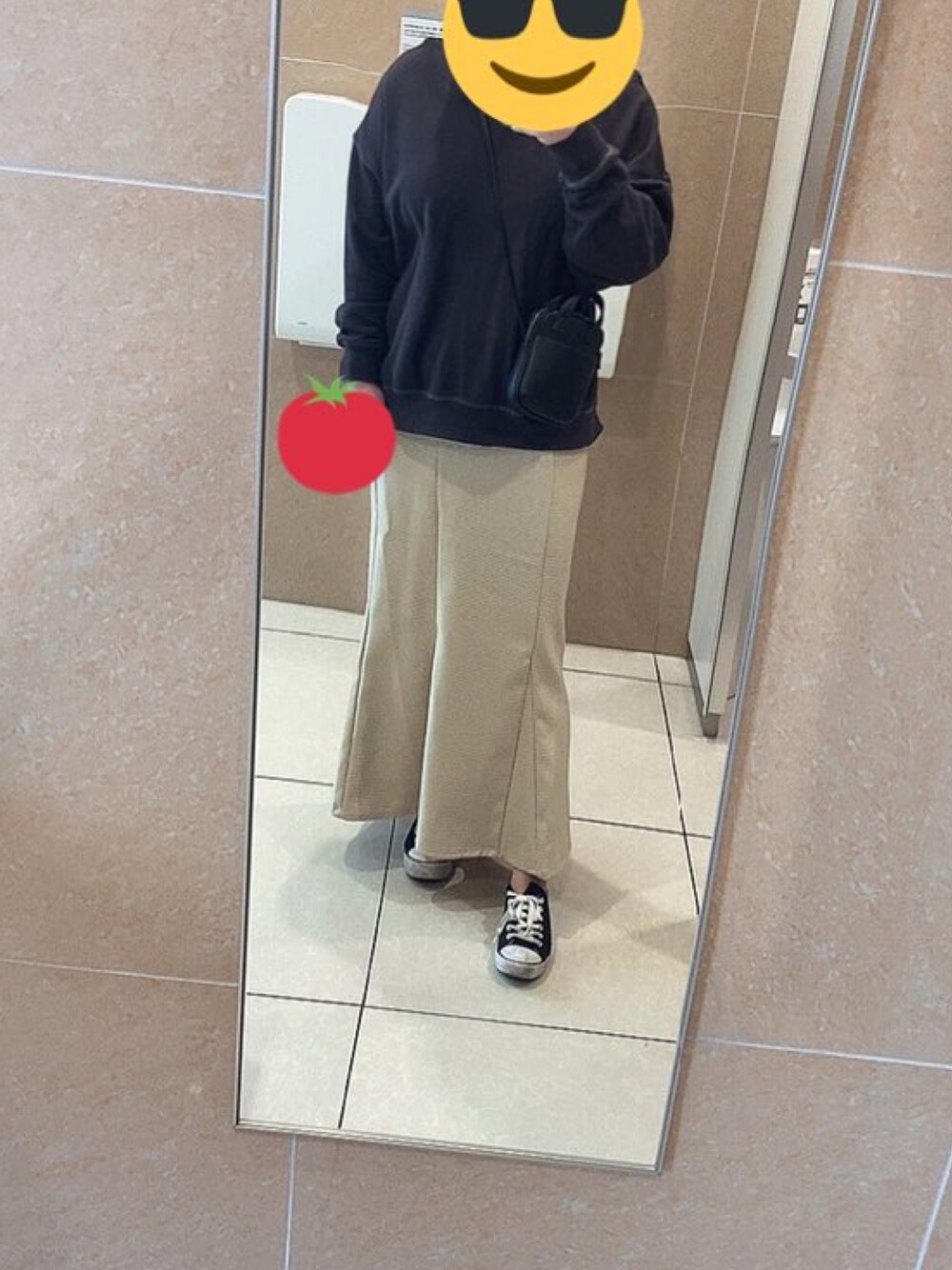 ちょっとそこまでコーデ めっちゃカジュアル カジュアルだけどマーメイドスカート履きたくて、見にくいんだけど千鳥格子柄のをチョイスしてみた〜 そして、トップスのスミクロがバックを隠しているww