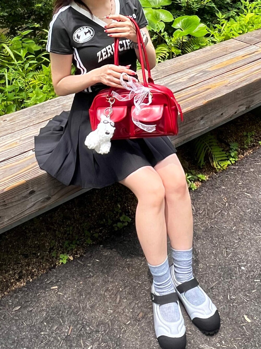 トップスとボトムスはブラックで統一しつつ、赤で差し色をいれることで今年らしいスタイルに❤️🔥