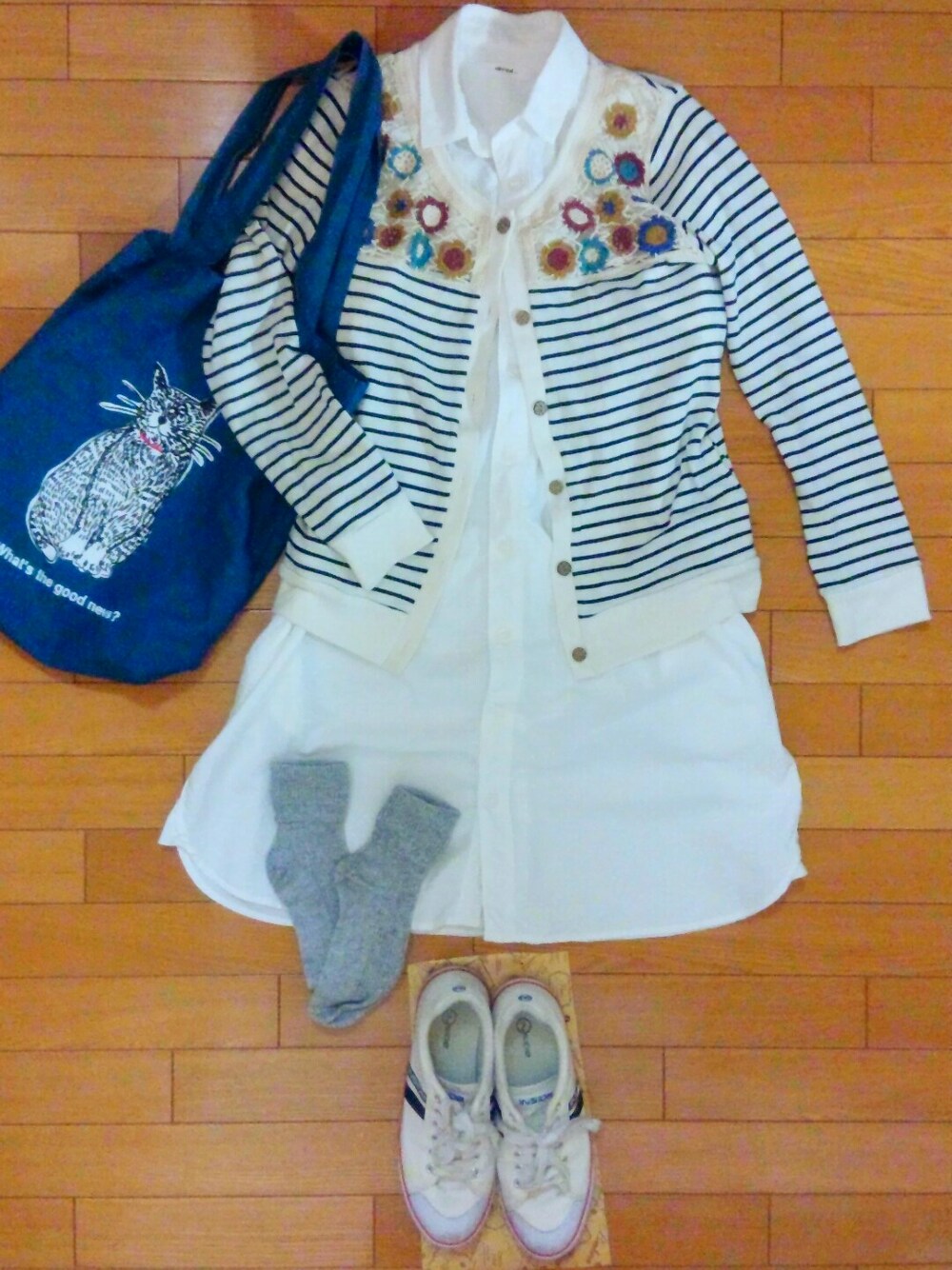 白ワンピ:niko and... お花ボーダー:tip top ネコバッグ:雑貨屋さん 暑つ~い! もうすぐ夏だ(*`Д´*)