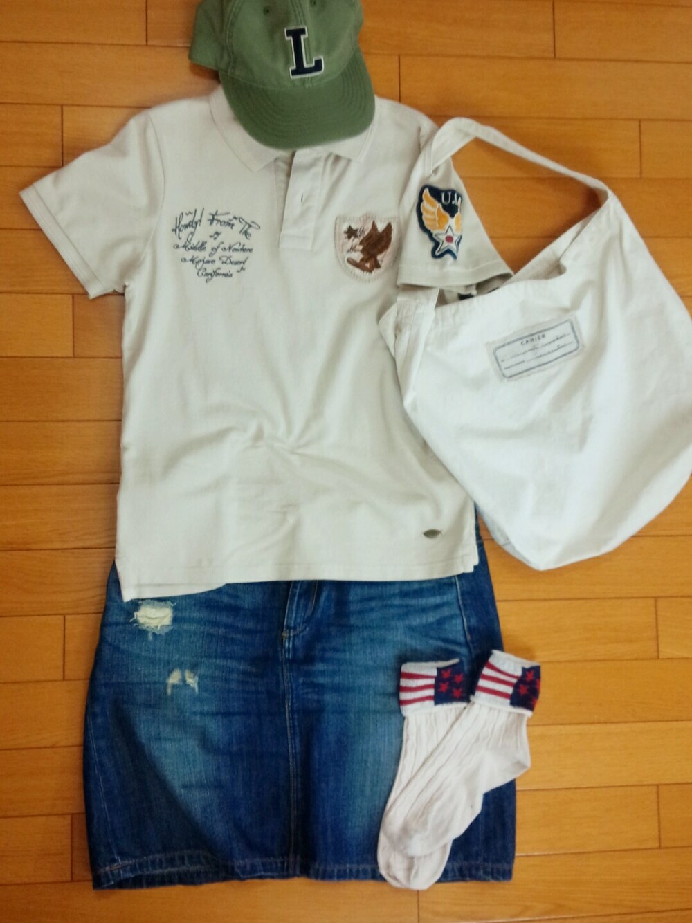 AVIREXの気球のポロシャツはアウトレットのsaleで 2000円しないで買えたという奇跡! ポロシャツ:AVIREX デニムスカート:HUSHUSH キャップ:UNIQLO