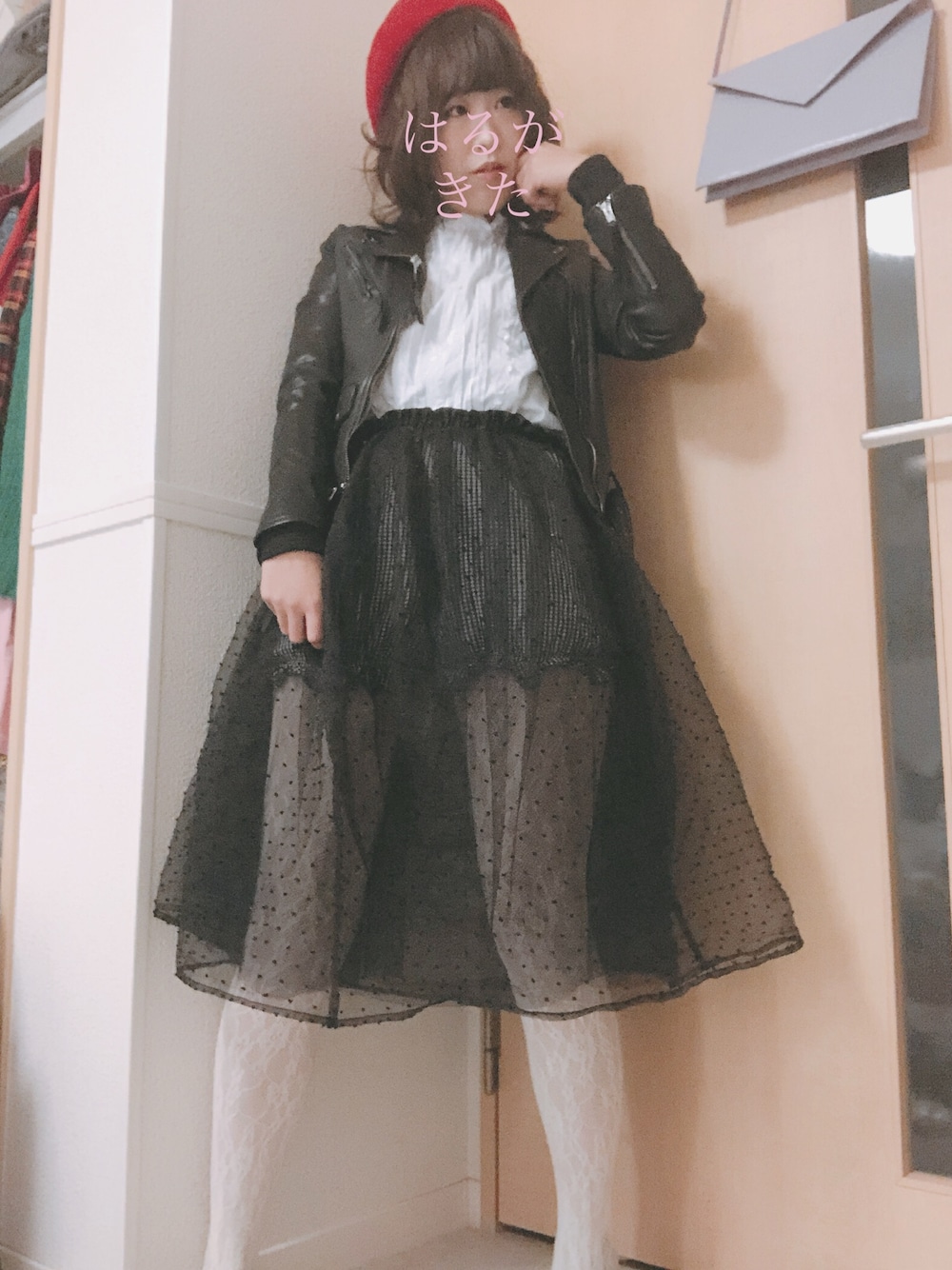 3月に入ってもう9日!!! 早すぎる!!! ご覧頂きありがとうございます🌸🌸 卒業式のシーズンですね! 今日のコーデは父に買ってもらった(半ば押し付けられた笑)ライダースジャケットを着たくて、自分らしく着るために試行錯誤しました💛 どうしてもかっこよく、大人っぽくなりがちなのでフリルがガーリーなブラウス、キッズらしさがあるかぼちゃパンツと合わせました。 足が出過ぎて恥ずかしいこともあり、黒のチュールスカートを重ねて、ガーリー感をゴリ押しするためにレースのタイツを合わせました。 写真では履いてないですが、ドクターマーチンの8ホールを合わせています。 そして最後に、色を入れたくて赤のベレー帽を合わせました。