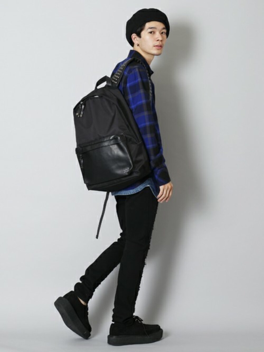 トップス:USED パンツ: unrelaxing バッグ : MEMENTISM ベレー帽 : unrelaxing model : 岩井拳士朗