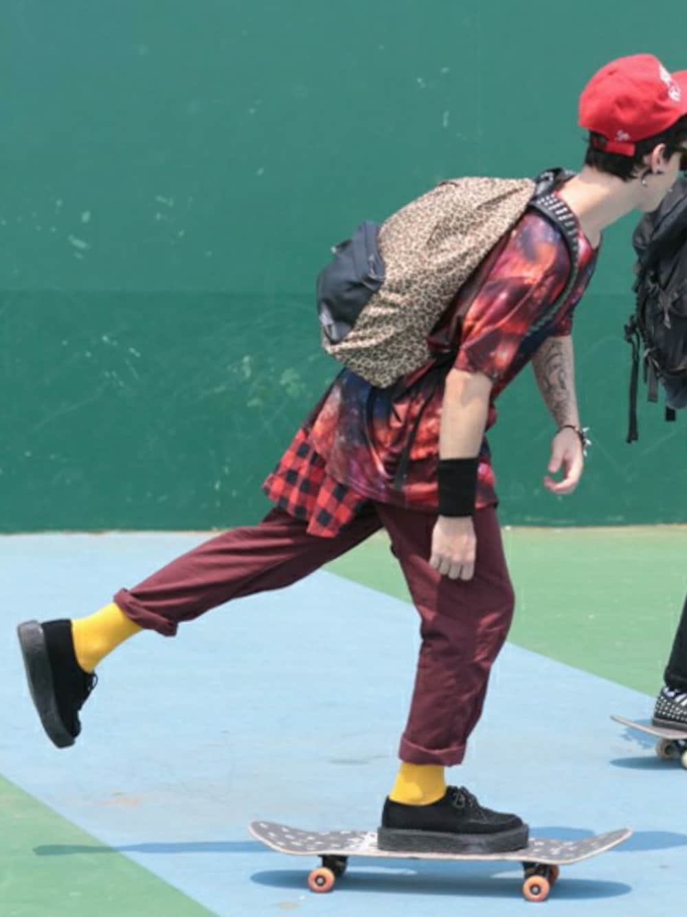 【PUBLIC EYES】のグラフィックTシャツ、【MEMENTISM】のショルダースタッズリュック、【Harris Brown】のラバーソールシューズを使用したコーディネートです。