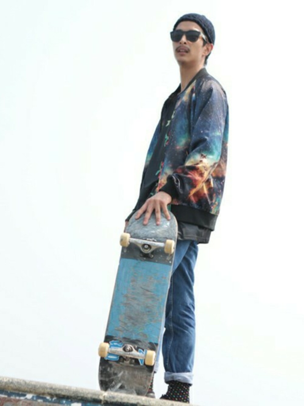 【PUBLIC EYES】のグラフィックブルゾンをメインに使用したコーディネート。