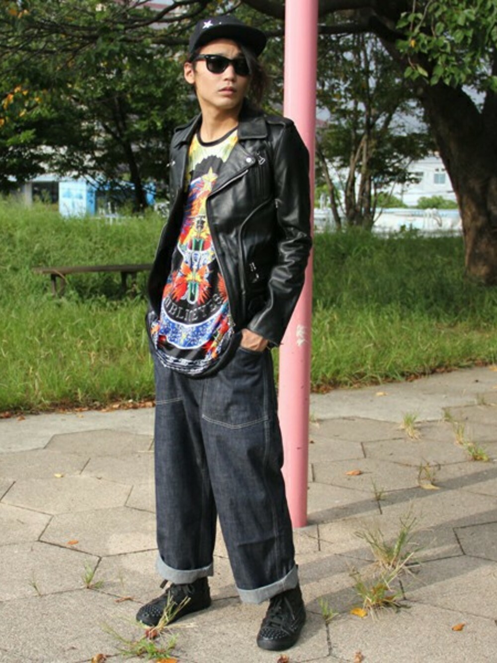 ハードなスタイルのインナーにグラフィックTシャツを差し込んだコーディネート。 足下にはインパクト大なスタッズスニーカーを履いています。 個性的なデザインながらオールブラックなので合わせやすくオススメの商品です。