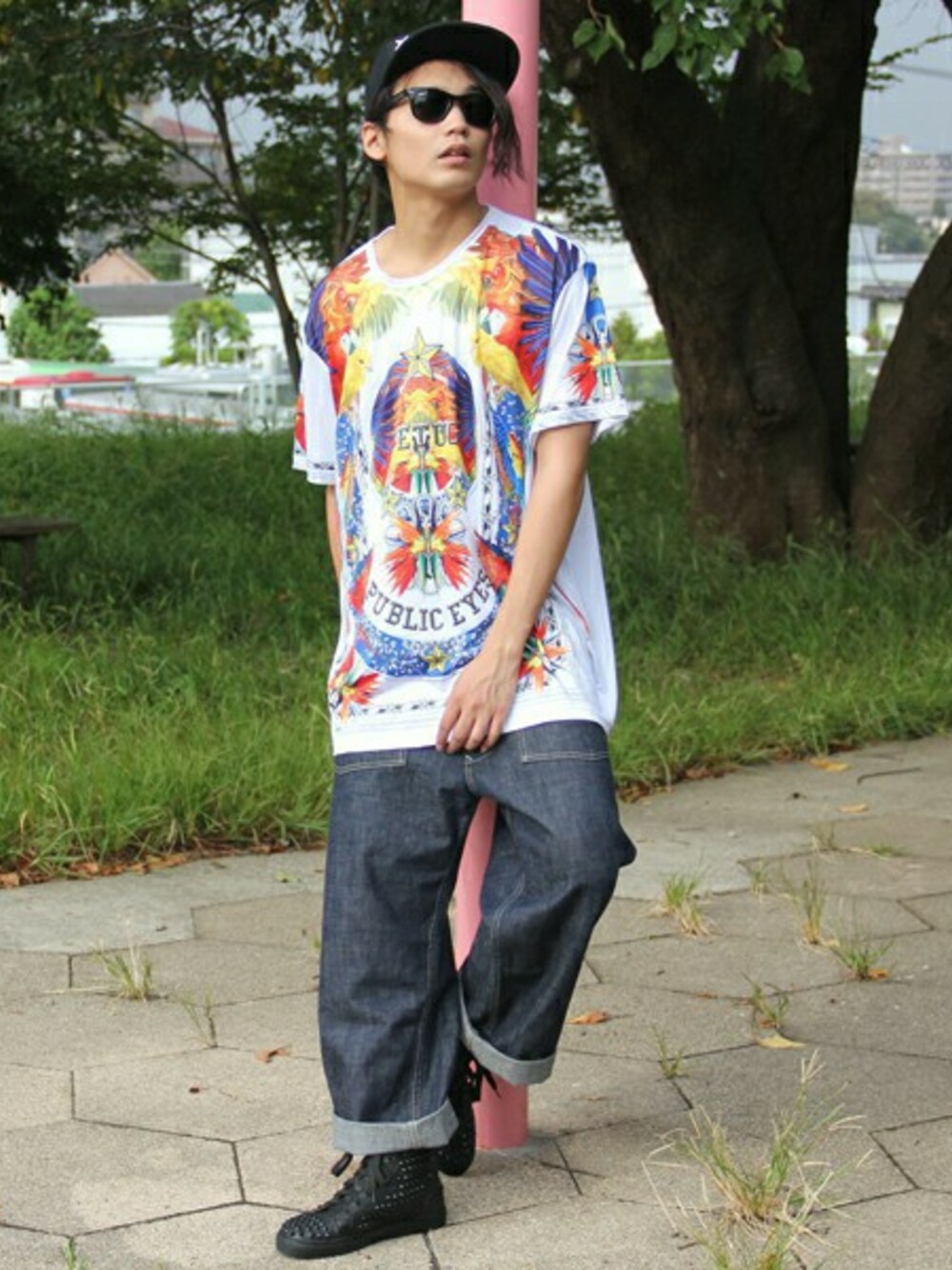 PUBLIC EYESのグラフィックTシャツは一枚でもコーディネートを印象付けれるアイテムです。 足元はHarris Brownのスタッズスニーカーで合わせました。 ハードなデザインながら、オールブラックで制作しておりますので合わせやすいオススメのアイテムです。