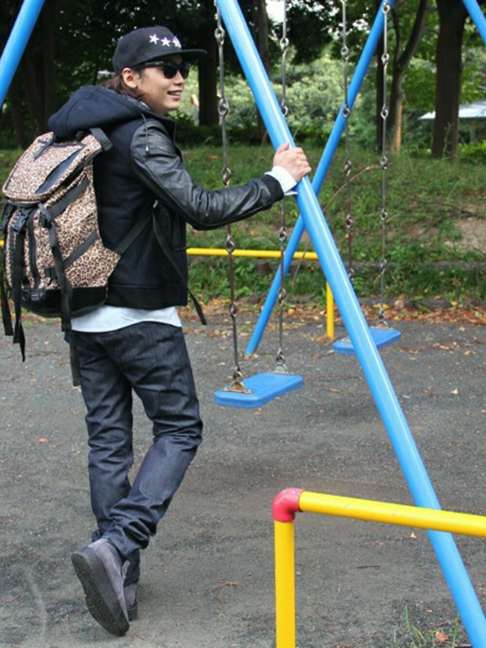 "バッグをアクセントにしたコーディネート" 【MEMENTISM】のアニマル柄リュックと【PUBLIC EYES】のフードスタジャン、【Harris Brown】のラバーソールシューズを使用したコーディネートのご紹介です♪ 全体をダークトーンで纏めたコーディネートにヒョウ柄リュックがアクセントになっております。 ラバーソールシューズはスタイルも良く見えるのでオススメです!!