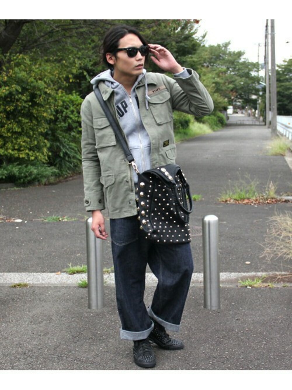 【MEMENTISM】のビッグスタッズネオレザートートバッグと【Harris Brown】のブラックスタッズハイカットスニーカーを合わせたコーディネートです。