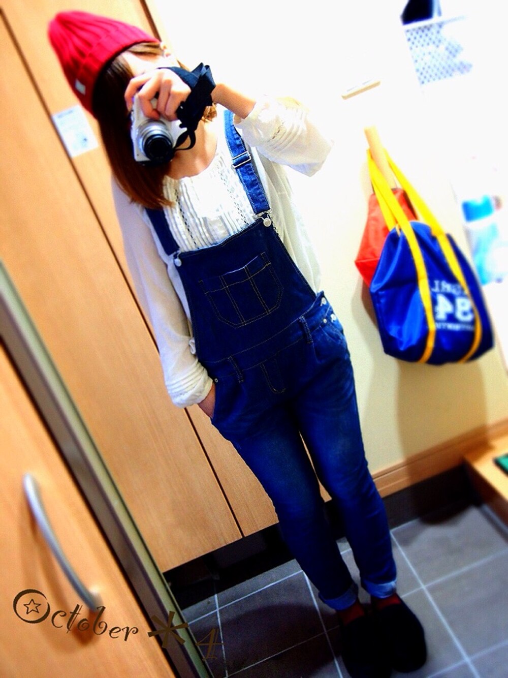 サロペットにブラウス♡ ニット帽は買ったばっかりです! 少しだけ見える靴下も赤です⁽⁽ଘ( ˊᵕˋ )ଓ⁾⁾ これに黒のリュック背負って お出かけしました\( ˆ ˆ )/♡