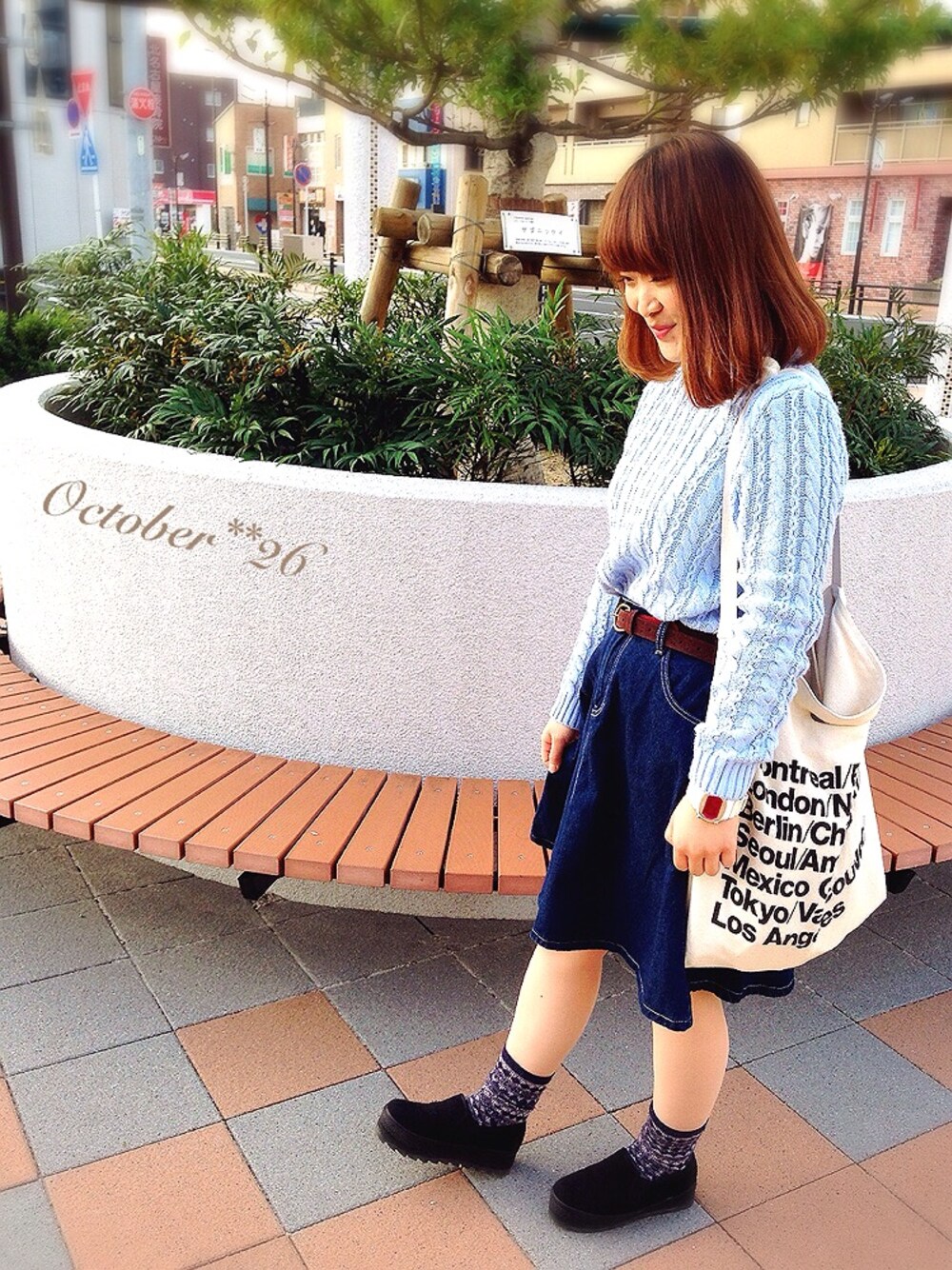 ブルー系のニット/セーターを着用したレディースの秋コーディネートの1枚目の写真