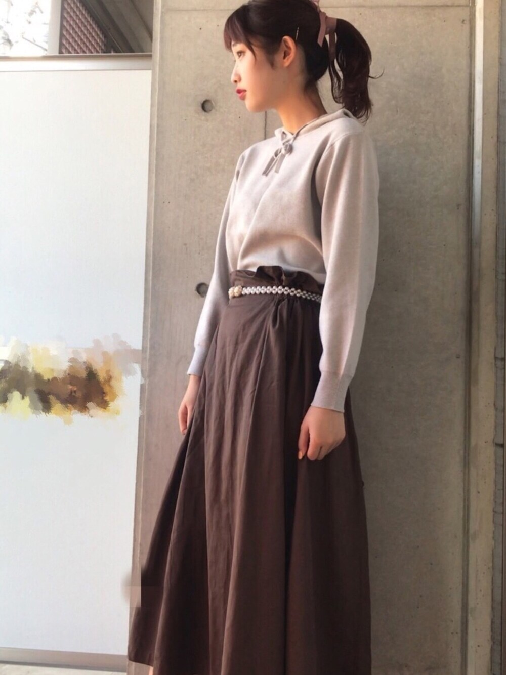 昨日のスカート着まわしコーデ ☺︎ ニットパーカーで合わせるとカジュアルな雰囲気で着れます☀︎ カジュアルすぎると可愛さが足りないのでベルトと髪の毛のリボンでガーリーっぽさをぷらすしました 🧸 ❤︎