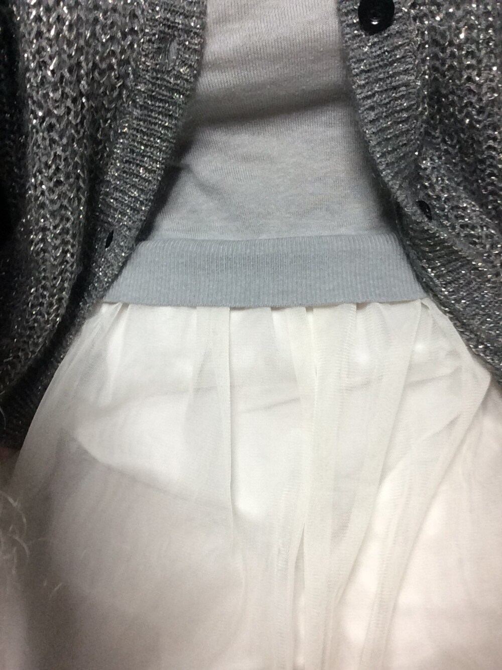 お出かけように購入しました。 チュチュがわりとすっきりしてヒラヒラしていないので、着心地Good!です。 いつも着ているカーディガンと合わせてみました。